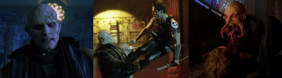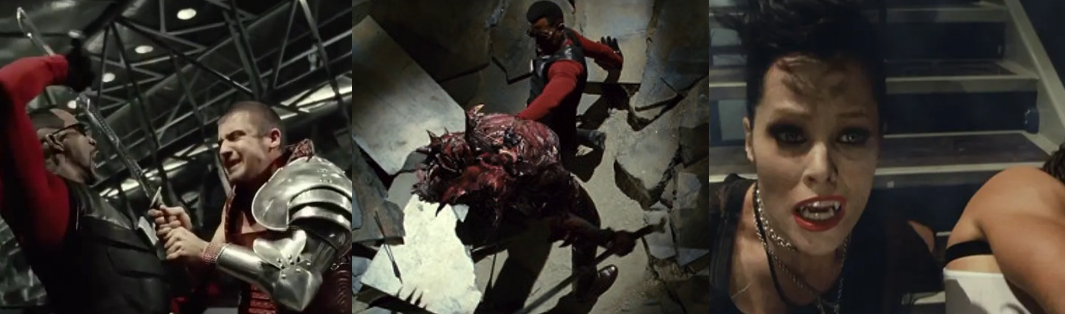 Echoing the same sense of superiority as the Pure Bloods of the previous films, Drake is said to be the first vampire, a demonic entity who’s never had to evolve who was a feared Sumerian warrior before entering a long period of hibernation after becoming disgusted by the world. However, as much as I enjoy Dominic Purcell’s work, he’s a poor fit for the role. With his stocky physique and robotic delivery, he’s very much the opposite of the Dracula legend as told by Hannibal, to say nothing of the classically trained actors who usual embody the part. While Blade: Trinity repeatedly downplays the movies and popular depictions of Dracula, Drake is fast enough to avoid bullets, exhibits superhuman strength, and is an accomplished shapeshifter. Drake strangely mimics Whistler to attack the Nightstalkers and is initially depicted as a monstrous, armoured demon overcome by “The Thirst”, a look that’s honestly more menacing and unique than his bog standard “Everyman” guise. Before he takes the lame-ass name “Drake”, Dracula is disgusted by Danica and modern-day vampires, rightly seeing them as “shadows” of their former glory. However, Drake’s convinced to begrudgingly aid them to test himself against Blade, whom he sees as the future of the vampire race and a formidable opponent. Drake is mesmerised by the modern world, it’s glorification of vampires, and how decadent and soft humanity and vampires have become. Unlike Blade, who resists the bloodlust of the Thirst, Drake gives into it at every opportunity, using it to further augment his abilities and freely feeding upon his victims to fuel his strength. Said to have the purest blood of all vampires, Sommerfield theorises that Drake holds the key to eliminating all vampires with Daystar just as Danica hopes Blade’s blood will ensure vampire survival. Thus, Blade and Drake are positioned as opposites and equals, though Dracula only ever appears as such when in his impressive, sadly little seen demonic form (which, interestingly, also sports Reaper-like fangs).