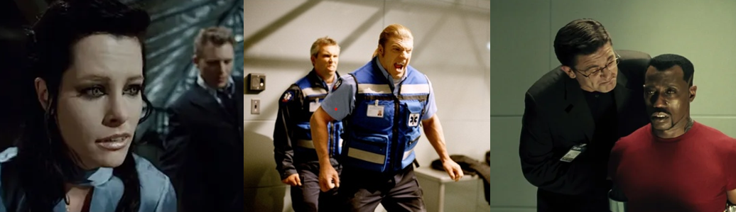 Things start out normal for everyone’s favourite dhampir as he knocks off vampires and operates out of a repurposed garage/warehouse much like in the first movie. Blade is oddly baffled when a victim shrugs off silver, despite claiming to have killed 1182 Familiars, and being easily fooled by fake fangs despite his heightened senses. This costs him when bystanders witness him killing a man in cold blood and Danica Talos (Parker Posey) releases the footage, painting Blade as a psychopathic murderer and exposing him to the Federal Bureau of Investigation (F.B.I.), specifically Agent Ray Cumberland (James Remar). While Blade’s mentor and father figure, Abraham Whistler (Kris Kristofferson) returns, he’s little more than a cameo who encourages Blade to rely on others and dramatically sacrifices himself holding off Cumberland’s strike team. The normally stoic dhampir is once again anguished by the loss, which further undermines his unnecessary return in Blade II. Much of Blade’s exchanges with Whistler set up his central character arc, namely his reluctance to rely on others or accept help (which is also a bit odd considering he worked with others, and even a vampire crack squad, before and Blade II painted him as a natural leader). Though Blade openly scoffs at the idea of having friends or relying on others, Drake’s threat forces him to fall in with the Nightstalkers, who Whistler secretly organised to aid him (despite them not appearing the last time Whistler died).