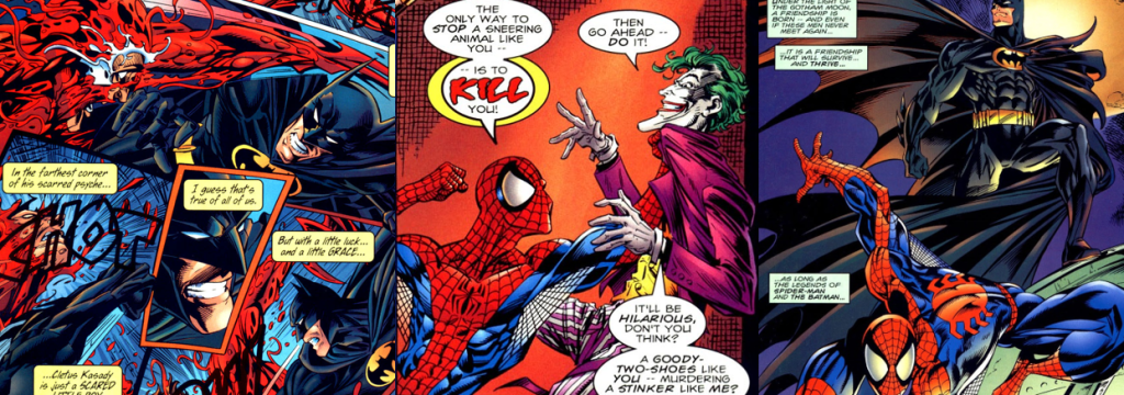 While the villains’ alliance is short-lived, Batman is soon recruiting Spidey’s help in dealing with Carnage.