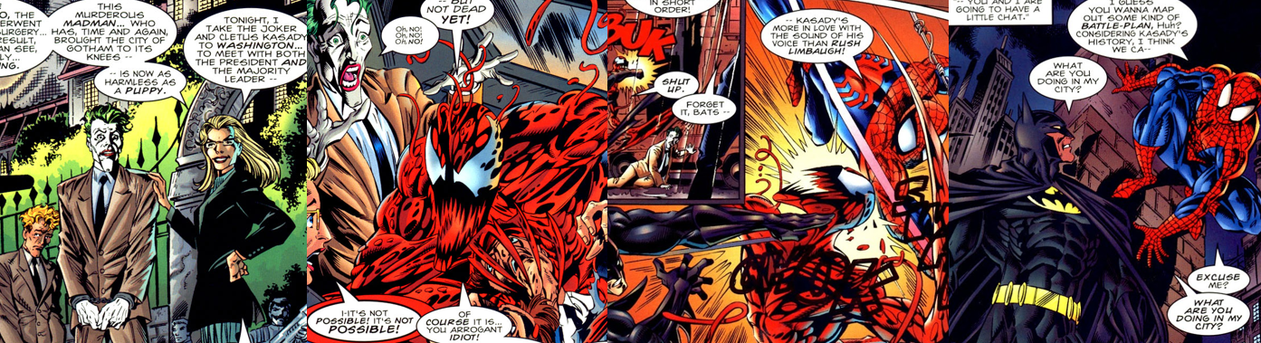 Though he has no time for Spider-Man’s quips and jokes, Batman recognises that he has unique insight into Carnage, and the two are able to track him to the wreckage of the Joker’s lair, where they find what appears to be his dead body but is, in fact, a decoy Carnage set up to trick the Joker. Delighted to have the Batman in his coils instead, Carnage plans to publicly execute Batman on top of Gotham Towers and, while comparing Carnage to Death itself, which passed him by back in Crime Alley, Batman orders Spider-Man to stop Carnage despite the threat to his life. However, it’s the Joker who actually intervenes in the tense showdown; claiming ownership over the Batman and determined to drop his virus on the four of them, killing all of them and everyone else in the city simply to spite Carnage, Kasady’s briefest flicker of fear is all the opening Batman needs to break free from his grip and leap into action. Spider-Man easily webs up the threat and, despite it taking the combined might of Spider-Man and Eddie Brock/Venom and many others in the past, the Batman is easily able to pummel Carnage into unconsciousness since, for all his powers and bloodlust, he’s simply another sloppy punk and a “scared little boy”. With Carnage subdued, Spider-Man chases down the Joker with an uncharacteristic rage; easily manhandling the Clown Prince of Crime, Spider-Man is barely able to stop himself from killing the Joker since he’s too great a threat, too dedicated to violence and chaos, to be left alive. While his better nature prevails and he ultimately spares the Joker, Spidey does deliver a knock-out punch to the cackling villain, finally bringing the story’s combined threat to an end. As if seeing Spider-Man pushed to the point of killing wasn’t surprising enough, Spidey is unusually quiet in his final confrontation with the Batman; weary from the night’s events, the two choose not to ruin the moment with words and instead part ways with a hearty handshake having found a common ground and a mutual respect through their conduct and escapades.
