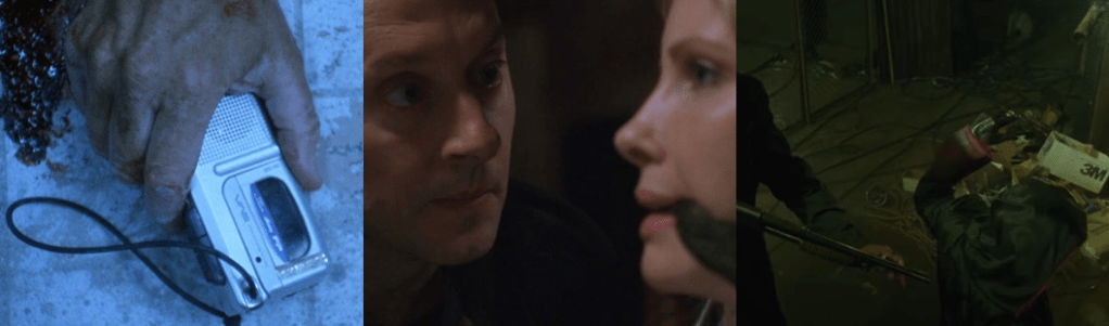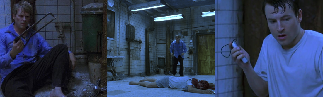 If there’s one theme in Saw, it’s of trust. Dr. Gordon and Adam almost instantly distrust each other not just because of their strange situation or Adam clearly trying to cover up his knowledge of Dr. Gordon’s identity and life, but also because of the class divide between them. Adam is a desperate mercenary, of sorts; he lives in squalor job to job, caring little for who pays him or why they want people followed or the lives of the person he’s photographing. In comparison, Dr. Gordon lives very comfortably; he has a nice house, a nice office, and takes his life for granted so much that he’s happy to rest on his laurels and even consider a fling with Carla (Alexandra Chun), one of his interns (though, ironically, he put a stop to the liaison before it could properly get underway right before he was abducted, showing that he was already planning to turn his life around and try harder with his family). There’s a discord between Dr. Gordon and Alison, to the point where she treats him very coldly since she believes he’s lying about his happiness, and Sing’s unwavering trust in Tapp is arguably what leads to his death since he doesn’t stop to question his partner in raiding Jigsaw’s warehouse. This leads me to the second most prominent theme in Saw: obsession. After his injury and Sing’s death, Tapp becomes obsessed with proving Dr. Gordon’s guilt, to the point where he’s fired, divorced, and turns to alcohol and isolation. Tapp’s so consumed by grief and obsession that he’s suffered a mental breakdown and has become obsessed with “closing [the] case”, and it’s this obsession that drives him not just to intervene when Zepp tries to kill Alison and Diana but also to pursue him to the bathroom, where he’s shot and killed in a brief struggle with the manic orderly.