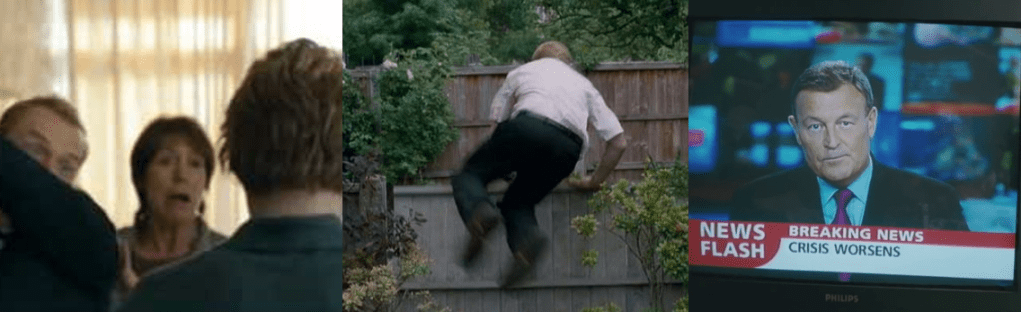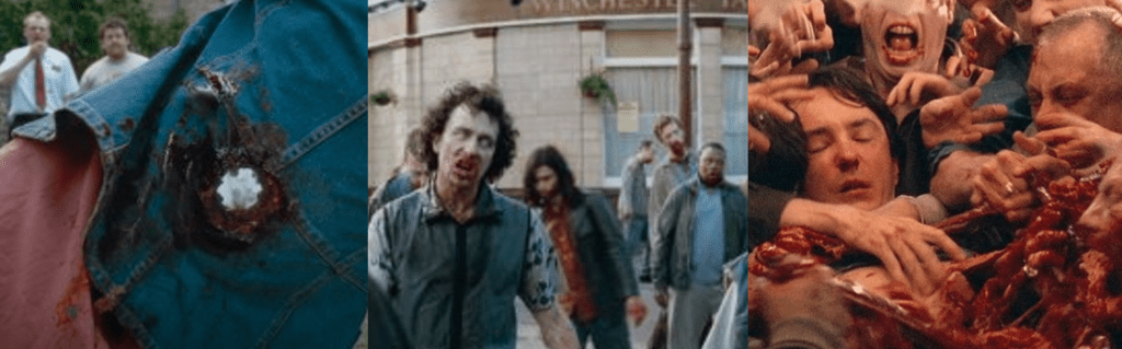 One of the most impressive, entertaining, and memorable aspects of Shaun of the Dead (and Edgar Wright films in general) is the unique and unexpected use of camera movements and jump cuts for comedic effect. Wright makes even mundane tasks like peeing and getting dressed for work appear exciting and humorous by filming them like action sequences and utilises a fun snap-cut to instantly turn night to day as Shaun passes out in the kitchen. Wright and Pegg’s writing is absolutely top-notch; the characters fun and relatable, while being vulnerable and desperately trying to adapt to the horrific events happening around them as best they can. The comedy is often based on repetition, references, and foreshadowing; Shaun’s plan to kill Philip and get to the Winchester, Ed’s suggestion to get drunk basically describes the events of the zombie outbreak the next day, and his videogame antics come back into play when defending the Winchester. Pete screams at Ed to “Go and live in the shed!”, which ends up happening in the epilogue, the tracking shot of Shaun’s morning perfectly captures how ignorant he is to the events happening around him, and when he flicks through the TV channels, all the different sound bites perfectly describe what’s going on in a fun little moment.
