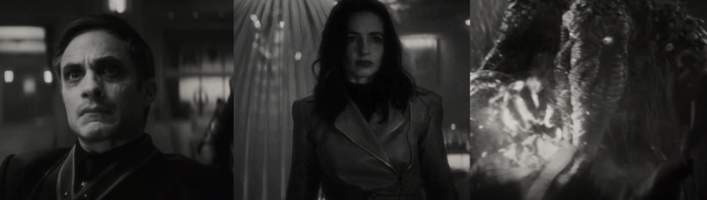While Lilia has no interest in joining the coven and is content as a fortune teller, Jen runs a successful (if dubious) skin care business, and Alice is perfectly happy believing the Witches’ Road is merely a fairytale that made her mother (Elizabeth Anweis) a rock star and led to her death, the three begrudgingly join the coven to regain their magic and out of curiosity regarding the Road. Each is chosen according to the legendary “Ballad of the Witches’ Road”, which calls for witches proficient in different magics, and each has their craft testing by the Road. Jen, who was accidentally bound by Agatha a hundred years ago, is pushed to cobble together an antidote in “Through Many Miles / Of Tricks and Trials” (Goldberg, 2024) and even saves Teen’s life after he’s injured conjuring the winged demon that’s cursed Alice’s bloodline. Alice learns that her mother performed “The “Ballad of the Witches’ Road” to protect her from this curse and gets to put it to rest before unexpectedly dying trying to save Agatha. Equally, the Road gives Lilia the chance to finally feel a sense of belonging after being left despondent at failing to save her previous coven with her clairvoyancy, which sees her experience time in a non-linear way and therefore appear crazy. The one outlier is Agatha’s kindly neighbour, Sharon Davis (Rupp), returning from WandaVision, who’s duped into joining the coven and dies during their first trial since they’re too busy squabbling to work together. She’s replaced by Vidal, an unpredictable and sadistic green witch who refuses to elaborate on her true relationship with Agatha, which is repeatedly depicted as frosty. Although the group are largely suspicious of each other, particularly the enthusiastic Teen and the untrustworthy Agatha, they soon bond, sharing stories of their personal tragedies and regrets, resulting in Jen being distraught when Lilia sacrifices herself in “Death’s Hand in Mine” (Schaeffer, 2024).