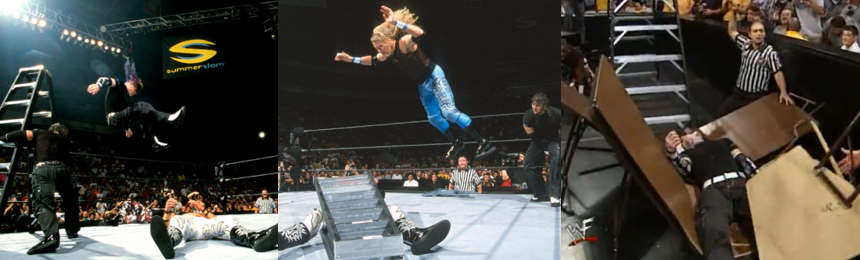 It was Drew McIntyre who came out on top of the predictable melee that followed. He booted and smacked down each man with ease, catapulted Christian face-first into a ladder, but took so long setting the ladder up in the ring that Matt Hardy was able to bash him in the spine and gut with another ladder. Matt then made the first significant climb up the ladder, only to be intercepted by old rival Christian. Matt returned the favour soon after and the two ended up brawling out of the ring, leaving Cody and Kofi to fight over the ladder. After bashing Cody’s face off the ladder, Kofi tried to go for the briefcase, but Dolph Ziggler intercepted him, clambered to the top, and was just seconds away from unhooking the briefcase when Christian interrupted him. The two exchanged blows at the top of the ladder but it was Ziggler who took the big fall to the canvas. There was a bit of a botch afterwards as Matt toppled the ladder and it seemed like Christian was supposed to spill out of the ring and onto the Big Show, but the positioning was off so he simply dropped to the ring and a slugfest broke out between the two, Cody, and Kofi to try and cover for it. Matt and Christian then worked together to counter an attempted double Chokeslam from Kane into a double DDT and then crushed him between two ladders before getting back into it in an exchange that saw Christian counter Matt’s Twist of Fate into a flapjack onto a ladder and then being crushed underfoot. Christian’s next attempt to climb the ladder saw that planned spot finally come to fruition as Cody toppled the ladder and Christian went flying into the Big Show on the outside. Cody, Kofi, and Matt then worked together to subdue Kane with a finisher-fest before McIntyre reinserted himself into the match by pushing Matt and Cody off the ladder and ramming both (and Ziggler) shoulder-first into the ring post, but it was Kane’s timely intervention that kept him from climbing. A baseball slide into a ladder ended Kane’s brief rampage; Kofi then resumed his recent rivalry with McIntyre by laying him out over the announce table with a Trouble in Paradise and then crushing the Sinister Scotsman through the table with a Boom Drop off a ladder!