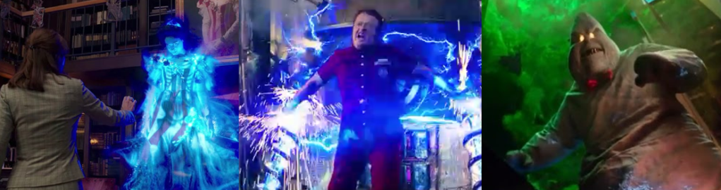 As the Ghostbusters investigate the spate of hauntings and slowly build their confidence in tackling and trapping ghosts, they discover strange devices not unlike their proton packs at each location. Together, the four figure out that they’ve been placed at ley lines, with Erin and Abby theorising they could weaken the barriers between life and death. This is exactly what Rowan hopes to do having grown despondent by humanity and society’s treatment of him and having made contact with the malevolent spirits seeking to “pester” the living with unspeakable tortures. Ignored and mistreated by those around him, Rowan easily places his devices and grows increasingly aggravated by the Ghostbusters’ interference, before dramatically killing himself so he can possess Abby and wreck their equipment. He then upgrades to hijacking Kevin’s body to enact the final stage of his plot, the activation of a large device that, similar to the first film, unleashes a hoard of ghosts upon New York City. When the Ghostbusters’ frantic warnings are met with scorn and dismissal, they suit up to tackle the threat directly, subduing Rowan’s army and confronting him in Times Square. There, he toys with them, promises to bring about the end of days, and eventually corrupts their iconic logo to become a Kaiju-sized apparition and go on a rampage not unlike Gozer the Destructor’s (Paddi Edwards/Slavitza Jovan) as a gigantic Mr. Stay Puft and the opening sequence of the old cartoon. Though their proton packs are useless against the creature, the Ghostbusters trick Slimer into driving Ecto-1 into the swirling vortex Rowan conjured, turning it into a giant ghost trap and sucking him in. Though Rowan tries to drag Abby down with him, Erin rescues her and the team are heralded as saviours, despite Mayor Bradley continuing to downplay the paranormal threat. In the aftermath, the Ghostbusters finally move into the iconic firehouse and further upgrade their operation thanks to secret funding from city officials, constructing a containment unit and a device to monitor spooky sound waves, alerting the team to a potential threat named “Zuul”…