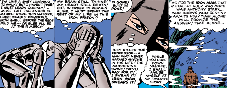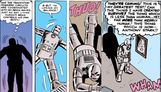 As the transistors charge up Stark’s suit, he is devastated to hear the sound of his friend being shot and killed and swears vengeance for him. Once the suit is fully charged, Stark’s life is saved; the transistors imbedded in the chest plate are vaguely depicted as being something akin to a life support machine that keeps Stark’s heart beating but we know, from the demonstration of the transistor’s magnetic powers that we saw earlier and from subsequent stories, that the suit is actually keeping the shrapnel at bay to keep Stark from dying. Surprisingly, and somewhat hilariously, Stark struggles to adjust to his new armoured suit, falling and having to take a panel or two to master the awesome power of the suit. Even more surprisingly, as Wong-Chu’s men head towards his cell, Stark has a moment of despair; he sees the oncoming battle as his “greatest test” and wonders if his suit will be up to the task while simultaneously doubting his own humanity and the unknown future that lays ahead of him as he must remain reliant upon, and encased within, his iron suit. It’s a startlingly affecting couple of panels and really shows just how much the experience has affected the formally carefree Stark.