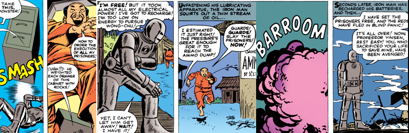 Though he easily uses his miniature buzz saw to cut through the locked door that hides Wong-Chu, Iron Man is briefly incapacitated when Wong-Chi is able to topple a rock-filled filing cabinet on top of him. Okay…first of all: where did Wong-Chu get the rocks to fill the filing cabinet and, secondly, how was is it he had the strength to push it down the stairs but Iron Man, with all his transistor-powered strength, struggled to lift it off of him? Regardless, Iron Man soon lifts the weight off of him but finds that he has exerted his power levels far too much and cannot pursue Wong-Chu. However, determined to keep the tyrant from slaughtering all of the prisoners in the camp, Iron Man squirts a thin stream of oil towards the ammunition storage building Wong-Chu is running past and ignites it, blowing Wong-Chu to smithereens without hesitation and leaving Stark to ponder his unknown future that lies before him as Iron Man.