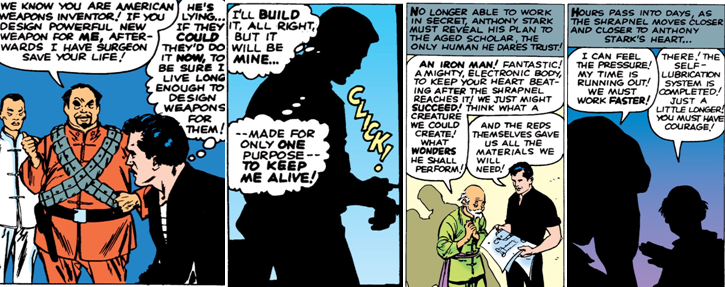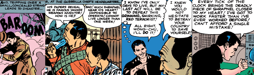 However, while wandering around in the jungle for apparently little other reason than to deliver exposition, Stark triggers an unseen booby trap and is captured by the Red Guerrillas while he lies wounded. At the Guerrilla chief’s headquarters, their physician reveals that Stark is in critical condition; shrapnel near his heart makes it impossible for them to operate and Stark will be dead within about a week. Undeterred, Wong-Chu decides to coerce Stark into using what little time he has left to make weapons for them instead. Immediately sensing Wong-Chu’s deception, Stark agrees to their terms if only to use their resources in one last, desperate attempt to keep himself from dying. Considering he has untold pieces of shrapnel lodged in his chest and is, apparently, in critical condition and mere days away from death, Stark is rather spirited, able to stand, walk around, and work himself around the clock with only the looming threat of his impending demise working against him rather than, you know, agonising pain.