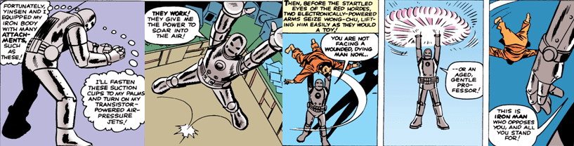 Pragmatic as ever, Stark utilises his “transistor-powered air-pressure jets” to perform a great vertical leap and hides from Wong-Chu’s forces using “suction cups” to cling to the ceiling. After hearing clarification of Yinsen’s death, Stark again swears to make the Red Guerrilla’s pay for killing an innocent, harmless old man as Iron Man. Out in the courtyard, Wong-Chu is celebrating another victory over a hapless villager when Here Comes a New Challenger!! Iron Man approaches Wong-Chu and challenges him to single combat, easily besting him with his transistor-powered strength.