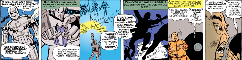 Iron Man’s reinforced metallic shell is even capable of deflecting bullets and, when Wong-Chu orders the use of grenades, Iron Man simply “[reverses] the charge in [a] magnetic turbo-insulator” and “[uses] a top-hat transistor to increase its repelling power a thousandfold” to deflect the incoming projectiles. Wong-Chu is incensed when his men flee from Iron Man’s power and uses a loudspeaker to offer a thousand yen reward to the man who can destroy the metallic menace who threatens his rule; however, Iron Man uses “electrical interference” to drown out Wong-Chu’s words and replace them with an order for the Red Guerrillas to flee in panic.