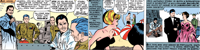 Having introduced us to Stark’s impressive technological genius, the story then spends the next couple of panels giving us a glimpse into the type of character Stark is. A rich, handsome, glamorous playboy, Stark is seemingly lusted after by every woman who lays eyes on him and is both a sophisticate, millionaire bachelor and a scientist who wants for nothing, is capable of getting, making, or having anything he wants, and who is one of the premier hot-shotters in the U.S.