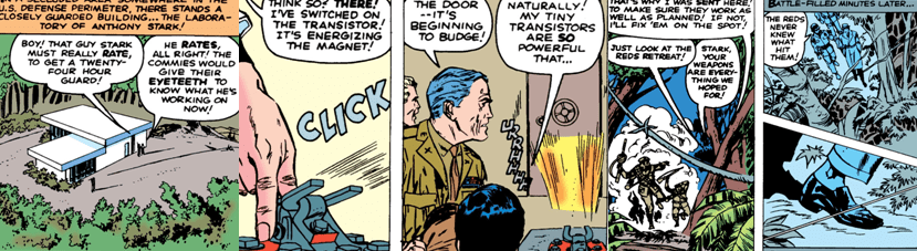 The Review: “Iron Man is Born!” begins in “a secluded area somewhere in the U.S. perimeter” where Anthony Stark is demonstrating the power and awesome potential of his “tiny transistors”. Though the General is initially unimpressed with Stark’s grandstanding, with just a flick of a switch, Stark’s transistor technology increases the power of even the smallest magnet a thousandfold to tear open even a heavily-sealed vault door in an impressive demonstration of the technology he believes to be “capable of solving [the] problem in Vietnam”.