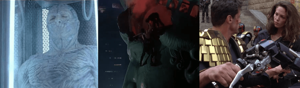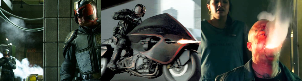 Although Dredd’s Judges don an extremely different uniform compared to the comics, I think it works really well; their helmets, especially, are as faithful as you could want, as are their badges, but the entire uniform is now more like practical riot gear rather than form-fitting spandex. Instead of heavy and cumbersome gold eagles and plates, they have reinforced armour that evokes the classic Judge imagery while still being believable. Of course, the big selling point of Dredd, like many films at the time, was its 3D effects. Dredd actually employs these effects into the plot and in an interesting way; whenever characters take a hit of Ma-Ma’s Slo-Mo drug, they’re inundated with a hallucinogenic high that sees them perceive time in slow motion. If its decidedly gloomy visuals and far grimmer interpretation of Judge Dredd didn’t immediately clue you in that Dredd was taking the character in a different direction, the film’s mature content soon will! There’s no “Drokk!” curses here (character’s drop the f-bomb at every turn) and no sugar-coating the bloodshed as perps are torn to shreds, often in agonising slow motion that really shows the bullets ripping through flesh and faces in gruesome detail. Easily the biggest and most explosive set piece in the film sees Ma-Ma’s gang unload on Dredd with three rotary cannons that tear through solid concrete and human flesh like they were tissue paper. Much of Dredd’s action scene involve him callously blasting at foes using his whittling ammunition; using cover and confusion from smoke and fire, Dredd guns down multiple armed foes with a deft grace thanks to Karl Urban carrying himself with a militaristic legitimacy. A bruiser of a fighter, Dredd absolutely brutalises even his fellow Judges in a fist fight, though for all his well-deserved reputation, he’s still a man and fully capable of being injured and enduring some harsh physical punishment as he insists on fighting through Ma-Ma’s forces.