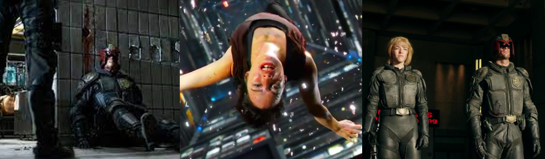 As ever, Mega-City One is a bleak, overpopulated, violent hell-hole; the Cursed Earth is only fleetingly seen and mentioned as the focus of Dredd is on the city itself, now no longer inspired by Blade Runner (Scott, 1982) or even that evocative of the source material and instead being a rundown mish-mash of existing US cities. In fact, the general rundown presentation of the city more recalls District 9 (Blomkamp, 2009), characterising the city as a much more grounded and realistic location which is actually in keeping with Dredd’s earliest appearances, before the term “Mega-City One” was coined. Amidst the ruins of the “old world” exist Mega Blocks, towering skyscrapers full to the brim with people from all walks of life, the streets are clogged with traffic and rioting, and hundreds of crimes break out every second of the day. Our time spent on the streets of Mega-City One is fleeting as, after responding to a homicide report at the Peach Trees Mega Block, Judge Dredd and Anderson are trapped in the futuristic tower block, cut off from backup, and left to deal not only with Ma-Ma’s crazy followers but the desperate inhabitants of Peach Trees who both refuse to shelter the Judges or out-right attack them to curry Ma-Ma’s favour. While restricting Dredd to such an unremarkable and claustrophobic environment may seem limited, it actually works quite well; the point of Dredd is not to be some world- or city-saving escapade, but to depict a typical, violent day in the life of the famous lawman, which is definitely succeeds at. Plus, Peach Trees is surprisingly diverse; it’s like a city within a city, containing living quarters in various states of disrepair, malls, drug dens, and its corridors and apartments acting as alleyways and crack houses, respectively. It’s in this desolate, rust-red tower block that the Blade Runner influence comes into play yet there’s still some impressive technology in Dredd’s gritty and grounded war-torn future; the Judges constantly monitor the city using advanced drones, impossibly huge skyscrapers pepper the city, and, while it can’t fly and has a more functional design, Dredd’s Lawmaster still allows him to easily chase down perps, fire upon them, and subdue lingering crowds. Dredd is again armed with the Lawgiver, which is still be tied to his genetic code so it’ll explode in the wrong hands and once again fires a variety of ammo, including hotshot rounds that burn a perp’s face from the inside out, high explosive rounds to blast through walls and blow off heads (!), and incendiary fire to immolate Ma-Ma’s followers along with half a floor of Peach Trees!