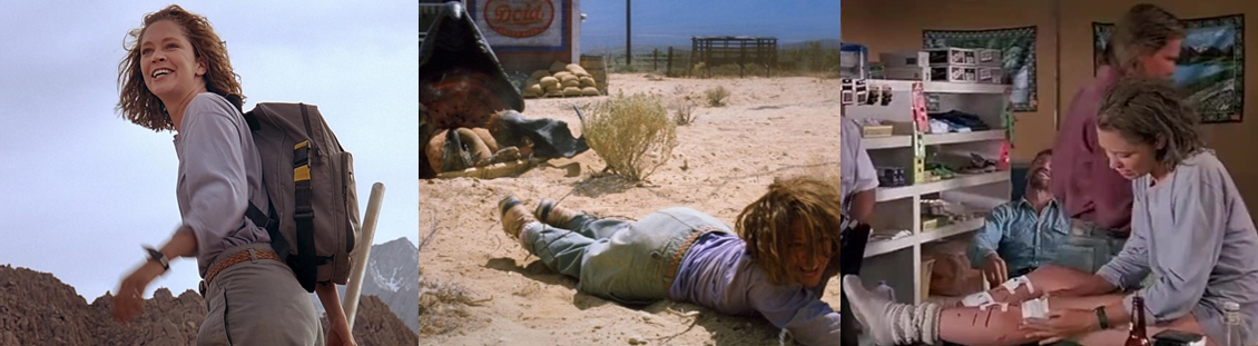 While out in the desert, Val and Earl come across graduate student Rhonda, who’s spending a semester investigating seismographs in Perfection and the surrounding area. Initially, Val is unimpressed by Rhonda, who doesn’t meet any of the criteria on his checklist, but Earl is eager for the two to spend more time together as she’s just the sort of down-to-earth young woman Val needs in his life. Rhonda’s research proves instrumental in discovering the extent of the threat lurking beneath the soil of Perfection, but even she is horrified to stumble across the duo with the corpse of a massive, carnivorous worm-like creature (later dubbed a “Graboid” by Chang and Melvin). Although she has no idea where the creatures came from or how they’ve remained undetected until now, a cursory investigation of the corpse allows her to deduce that Graboids are blind, hunt by sound, burrow using dozens of spiked appendages, and snag their prey with their mouth tentacles. Rhonda’s seismology readings reveal that three more of the creatures are lurking in the valley and she’s both captivated and terrified when she, Val, and Earl are stranded on rocks for most of the day and an entire night after narrowing escaping a Graboid. It’s during this impromptu marooning that Val and Rhonda first start to get closer; he gives her his jacket to keep her warm, helps her pole vault to her truck so they can escape back to town, and even tends to her wounds after she’s caught up in barbed wire. Although she’s hardly an expert, she’s the closest thing the townsfolk have but they struggle to process her instructions to stay quiet and stay high up. They’re more concerned with the who, how, and why of the creatures and only take their threat seriously when Graboids start bursting up through the ground and devouring their residents.