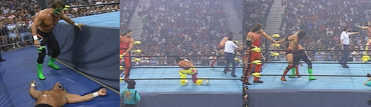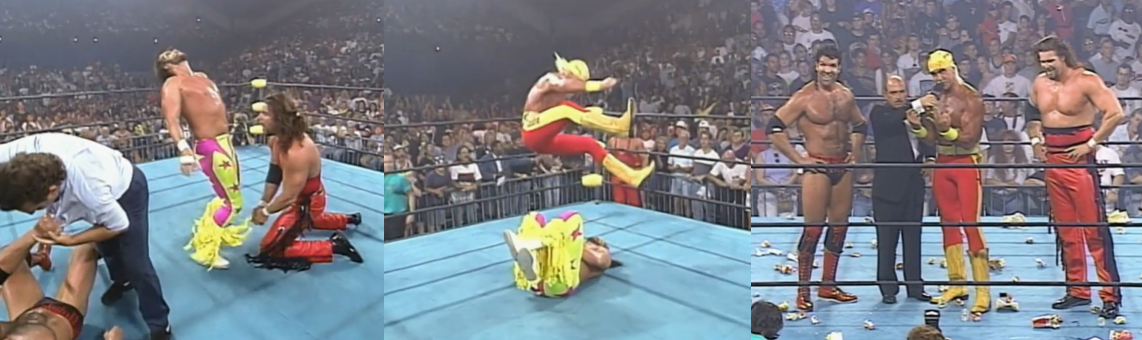 Stunned, Triple H retrieved his sledgehammer from under the ring but he was interrupted by, of all people, “Hollywood” Hulk Hogan, Kevin Nash, and Scott Hall of the nWo! Yes, Sting’s long-time enemies, who he vehemently opposed during arguably the most memorable moments of his entire career, actually helped him! This led to an admittedly awesome moment as the nWo finally got into it with D-X, it just had no place being in this match as it made no sense for them to defend either him or the “honour” of the long-dead company. Regardless, in the chaos, Sting dropped Triple H with the Scorpion Death Drop for a two count. Sting then reapplied the Scorpion Death Lock and Hogan moved the sledgehammer out of Triple H’s reach, which really should’ve been the finish to the match. Instead, Triple H grabbed the ropes (which shouldn’t have counted as it was a no disqualification match…) and Sting was blasted by a Sweet Chin Music from the ”Heartbreak Kid” Shawn Michaels! Since Triple H was slow to cover, Sting kicked out, so D-X slid Triple H his sledgehammer and Sting’s hated enemy, Scott Hall, passed him his trusty baseball bat. Sting not only nailed Triple H with the bat, he also comically snapped his sledgehammer in two before unleashing a flurry of strikes in the corner. A Stinger Splash followed but, rather than hitting a second and bringing the match to a close in a feel-good moment, Triple H blasted Sting in the head with the tip of his sledgehammer and pinned him for the three count! To make matters worse, the two shook hands in a show of respect after a tense showdown between their factions! This match feels like it was put together by someone who had no idea about anything that happened in WCW and just wanted to see D-X and the nWo have a scuffle while putting the final nail in the coffin of the long-dead company. Sting looked pretty good but it was clear from the rest holds that he was getting a bit gassed by the middle and, honestly, this match should’ve made better use of the no disqualification stipulation to help with this. Instead, it was tonally all over the place, with Sting proving a daunting figure but being buried by JBL, him getting the better of Triple H but being beaten by a sledgehammer to the face, and then him shaking Triple H’s hand afterwards like he was beaten by the better man and not a brute who cheated to win.