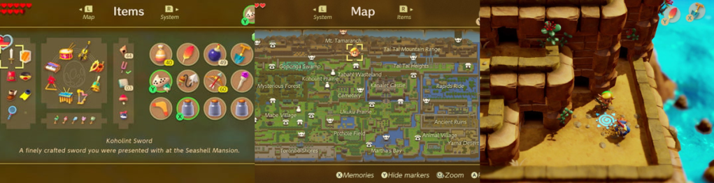 As before, Link’s weapon inventory is painfully limited. It can be expanded by finding Korok seeds, but only one slot at a time and the cost increases as you progress. Link’s defensive options are also tied to his outfits, which are found in chests, tied to tricky side quests, or bought from various shops for ridiculous prices. Instead of relying on gathering Rupees, you’re better off selling the precious gems you find by smashing rocks with rock-Fused weapons. You’ll need to do this as Link won’t last long in extreme heat or cold without the right outfits, and some offer additional perks such as speeding up your swimming rate, rocketing you up waterfalls, resisting elements, and upping your attack and defence. Rather than collecting hearts from defeated enemies, Link can either spend Rupees at an inn, collect a “Light of Blessing” from Shrines, or cook meals. This time, any meals you cook are recorded for easy reference; meals can also have added effects, such as temporarily increasing your maximum hearts and stamina wheel. To permanently extend these, you must trade four Light of Blessings at prayer statues dotted around Hyrule to gain either a new heart container or an extra slither to your stamina wheel, a process that remains as tedious as before. Similarly, you can still sneak up on and tame wild horses, adding them to stables and calling them with a whistle. If you have a Breath of the Wild save file, your horses will even be carried over, which is nice. There is a generous fast track mechanic, as before, but you must again activate towers (revealing more of the map in the process) or beat Shrines to utilise this. Finally, you can jump from high places and glide using your Paraglider and, though you can’t drop bombs like before, you can whip out your bow and use the slowdown effect to pick enemies off and, eventually, speed up your gliding with a gust of wind.