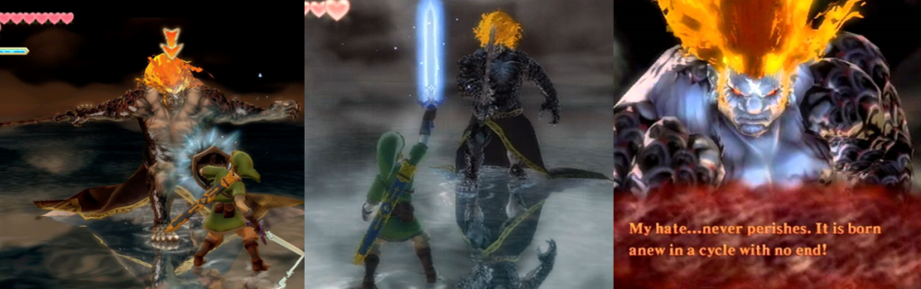 Hyrule is also populated by various mini bosses. Boss Bokoblins are larger versions of regular Bokoblins that wield big clubs and can take quite a beating, caves house different elemental Like-Likes, and giant stone Talus’ assemble from the environment to catch you by surprise, with their only real weak point being the Ore Deposit on their heads. If you’re really unlucky, a massive cyclopean Hinox will wake up and chase you (though targeting the eye turns the tide in your favour), mutated crocodile-like Molduga burrow through the Gerudo Desert and in the sands of the Depths, and a combination of the two, the Frox, also appears down there, sporting the same weaknesses as both. Flux Constructs are usually found in the skies; these sentient Zonai cubes are controlled by a central cube that must be targeted before they pummel you into the stone. Master Kohga also returns, having dropped to the Depths and mastered the Autobuild ability to fashion giant trucks, flying machines, and even a mech to rival Mineru. Though he’s more troublesome this time around, he’s quite susceptible to arrows in each encounter. Before he joins your cause, you must fight the brainwashed Yunobo, dodging his cannonball-like roll in a prelude to one of Ganondorf’s devastating charge attacks. Though far less prominent (at least in my playthrough), powerful, centaur-like Lynels still exist in Hyrule, with a silver variant encountered in the Gloom-filled Depths prior to battling Ganondorf. They’re joined by the various elemental Gleeoks, massive, three-headed dragons that breathe fire, frost, and lightning and are lorded over by an even tougher king. I’m gonna be honest and say I never fought these; I saw them flying around or standing atop mountains and felt their power in the intense weather effects they emit, but didn’t dare test myself against them (or the Lynels, for that matter). Similarly, I simply fled from every Gloom Swarm so I wouldn’t be decimated by Phantom Ganon, though you’re forced to fight this terrifying foe at least twice, once when exploring Hyrule Castle and again to free the Great Deku Tree. Phantom Ganon acts as an appetiser for Ganondrof’s battle, charging with a sword, striking with a lance, causing massive shockwaves with a club, duplicating himself, and spreading Gloom everywhere in easily some of the toughest battles in the game.