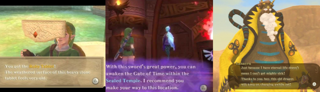 Link’s model, like all the character models, appears essentially unchanged from Breath of the Wild save for some different attire and his new monster arm. When in sweltering heat, he pants and sweats; when in blistering cold, he shivers; and when standing too close to an explosion, he catches fire. Although he doesn’t speak save for some grunts, there are dialogue options here and there that show is does communicate with those around him. Other NPCs communicate through traditional text boxes or voice acting, which is generally saved for the more dramatic cutscenes and the various memories. Link’s companions have a fair bit of personality, with Yunobo being a standout for me since he’s brainwashed into turning against his people and then determined to make up for it with an enthusiastic gusto! Tears of the Kingdom takes the expansive overworld from Breath of the Wild and expands upon it considerably. The surface is largely the same from what I remember, featuring towns, swamps, mountains, a massive volcano, and rushing waters. Settlements like Kakariko Village and Hateno Village remain, with Link now having a home and encountering many of the same NPCs (some of whom recognise him and others who strangely don’t). The landscape is altered by the presence of chasms leading to the Depths but still contains hidden caves, stables, the ruins of the old world, and recognisable landmarks like the Temple of Time. Hyrule is gigantic and full of different cultures, from the distrustful Gerudo in the arid desert to the proud Zora in their waterfall kingdom. Each area has different weather effects to worry about, from stifling heat to bitter cold, something exacerbated by random thunderstorms and the titanic elemental Gleeoks. There’s also a day/night cycle present, some mist and fog effects here and there, and a real sense of the world having changed both between games and from the fallout of the Upheaval, which sees debris rain from the skies and uncovers long-forgotten ruins that you must explore and decipher.