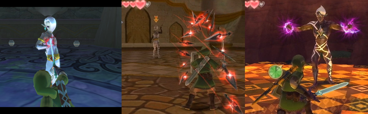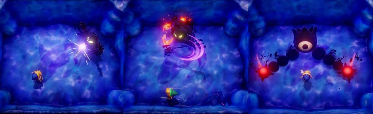 Hyrule is also populated by various mini bosses. Boss Bokoblins are larger versions of regular Bokoblins that wield big clubs and can take quite a beating, caves house different elemental Like-Likes, and giant stone Talus’ assemble from the environment to catch you by surprise, with their only real weak point being the Ore Deposit on their heads. If you’re really unlucky, a massive cyclopean Hinox will wake up and chase you (though targeting the eye turns the tide in your favour), mutated crocodile-like Molduga burrow through the Gerudo Desert and in the sands of the Depths, and a combination of the two, the Frox, also appears down there, sporting the same weaknesses as both. Flux Constructs are usually found in the skies; these sentient Zonai cubes are controlled by a central cube that must be targeted before they pummel you into the stone. Master Kohga also returns, having dropped to the Depths and mastered the Autobuild ability to fashion giant trucks, flying machines, and even a mech to rival Mineru. Though he’s more troublesome this time around, he’s quite susceptible to arrows in each encounter. Before he joins your cause, you must fight the brainwashed Yunobo, dodging his cannonball-like roll in a prelude to one of Ganondorf’s devastating charge attacks. Though far less prominent (at least in my playthrough), powerful, centaur-like Lynels still exist in Hyrule, with a silver variant encountered in the Gloom-filled Depths prior to battling Ganondorf. They’re joined by the various elemental Gleeoks, massive, three-headed dragons that breathe fire, frost, and lightning and are lorded over by an even tougher king. I’m gonna be honest and say I never fought these; I saw them flying around or standing atop mountains and felt their power in the intense weather effects they emit, but didn’t dare test myself against them (or the Lynels, for that matter). Similarly, I simply fled from every Gloom Swarm so I wouldn’t be decimated by Phantom Ganon, though you’re forced to fight this terrifying foe at least twice, once when exploring Hyrule Castle and again to free the Great Deku Tree. Phantom Ganon acts as an appetiser for Ganondrof’s battle, charging with a sword, striking with a lance, causing massive shockwaves with a club, duplicating himself, and spreading Gloom everywhere in easily some of the toughest battles in the game.