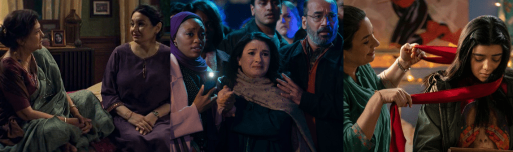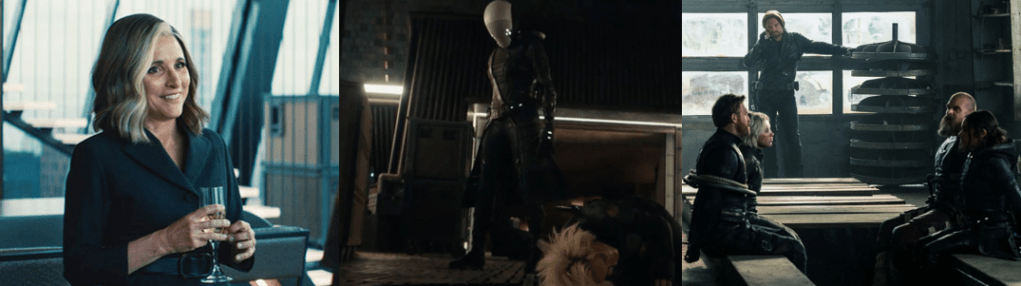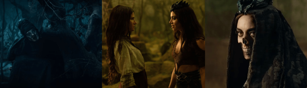 While Lilia has no interest in joining the coven and is content as a fortune teller, Jen runs a successful (if dubious) skin care business, and Alice is perfectly happy believing the Witches’ Road is merely a fairytale that made her mother (Elizabeth Anweis) a rock star and led to her death, the three begrudgingly join the coven to regain their magic and out of curiosity regarding the Road. Each is chosen according to the legendary “Ballad of the Witches’ Road”, which calls for witches proficient in different magics, and each has their craft testing by the Road. Jen, who was accidentally bound by Agatha a hundred years ago, is pushed to cobble together an antidote in “Through Many Miles / Of Tricks and Trials” (Goldberg, 2024) and even saves Teen’s life after he’s injured conjuring the winged demon that’s cursed Alice’s bloodline. Alice learns that her mother performed “The “Ballad of the Witches’ Road” to protect her from this curse and gets to put it to rest before unexpectedly dying trying to save Agatha. Equally, the Road gives Lilia the chance to finally feel a sense of belonging after being left despondent at failing to save her previous coven with her clairvoyancy, which sees her experience time in a non-linear way and therefore appear crazy. The one outlier is Agatha’s kindly neighbour, Sharon Davis (Rupp), returning from WandaVision, who’s duped into joining the coven and dies during their first trial since they’re too busy squabbling to work together. She’s replaced by Vidal, an unpredictable and sadistic green witch who refuses to elaborate on her true relationship with Agatha, which is repeatedly depicted as frosty. Although the group are largely suspicious of each other, particularly the enthusiastic Teen and the untrustworthy Agatha, they soon bond, sharing stories of their personal tragedies and regrets, resulting in Jen being distraught when Lilia sacrifices herself in “Death’s Hand in Mine” (Schaeffer, 2024).