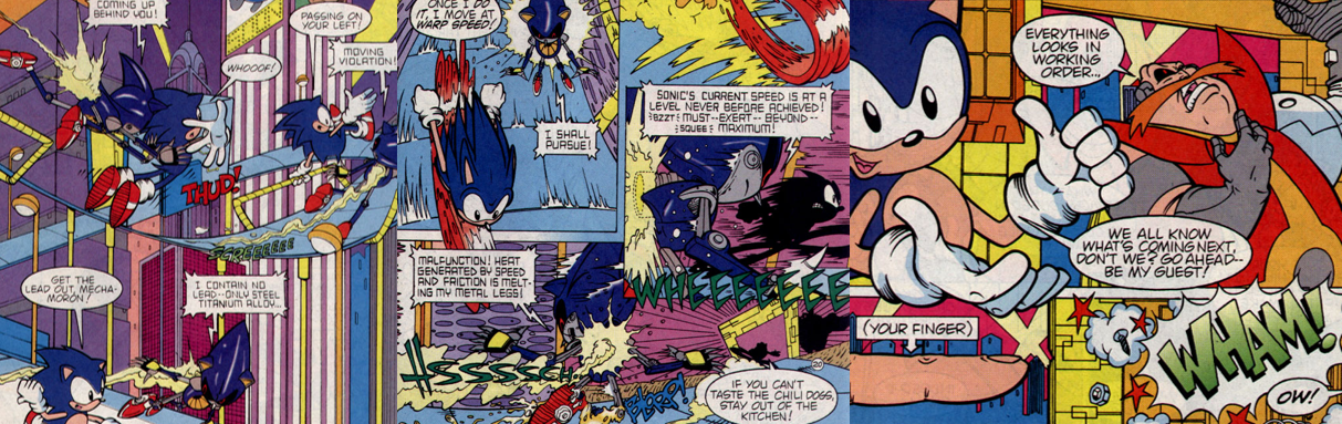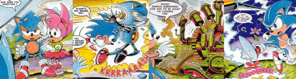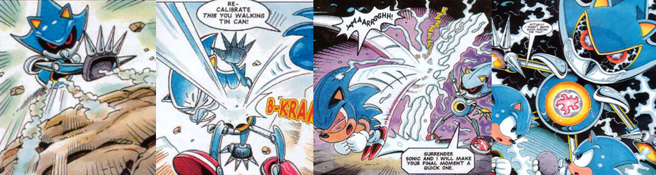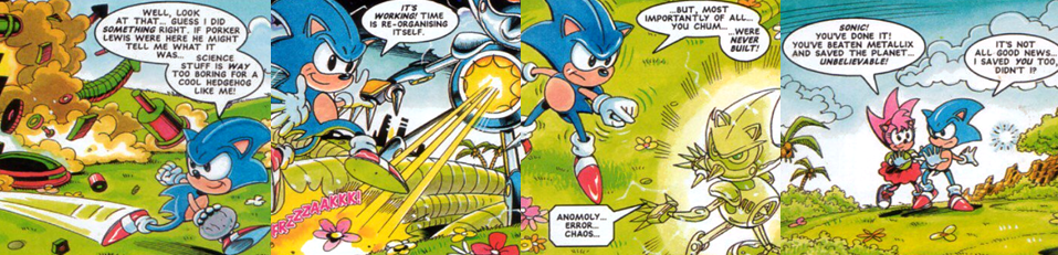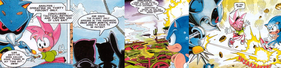 Over the course of a few action-packed panels, a fight breaks out between Sonic and his unusually loquacious doppelgänger. Metallix tosses boulders at Sonic, all of which he is able to expertly hop over and burrow through, but he is surprised by the robot’s chest laser. The two them battle so fast and so aggressively that neither Amy, nor the reader, are able to make out the action. In the aftermath, Metallix emerges from the dust and smoke as the apparent victor before collapsing into shutdown. Sonic, battered and weary, still finds the energy to insult Amy but, while he appears to have defeated his robotic counterpart, Metallix hits him with a cheap shot and takes Amy to the Miracle Planet as “live bait” and the unimpressed Sonic races off in pursuit. By the time the Freedom Fighters arrive to help, they’re already too late as the Miracle Planet disappears before their eyes, trapping all on its surface in another dimension for an entire month. On the miniature world, Sonic quickly reunites with Amy (much to his dismay) in what appears to be the Bad Future of Metallic Madness. Both characters question how Dr. Robotnik was able to convert the Miracle Planet so quickly, given that the previous month showed no signs of his influence, but their conversation (and the prospect of them being marooned there for a month) is soon interrupted by Metallix. Uncharacteristically, Sonic chooses to flee rather than fight but, as Metallix charges its laser to kill Amy, he comes flying back in with a big Spin Attack after running around the entire planet in a few seconds. Metallix, however, is able to draw additional power from the mechanical surface of the planet; this allows him to erect an electrical shield and charge up a kill shot for his prey after Sonic trips on a loose cable.