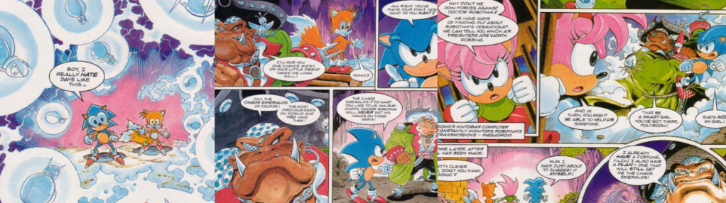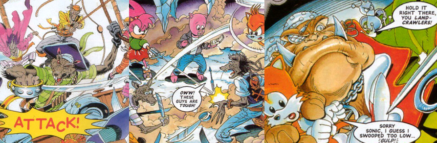Finally for today, we have “Pirates of the Mystic Cave”; this story is actually something of a prelude to StC’s later adaptation of Sonic CD and introduces readers to one of StC’s more annoying recurring original characters, Captain Plunder and his Sky Pirates. The story sees Sonic, Tails, Porker, and Johnny exploring the Mystic Cave Zone in search of Amy Rose, Sonic’s lovelorn number one fan who joined the Freedom Fighter team some issues prior and had a knack for getting herself in trouble. While there, they’re attacked by the caterpillar-like Crawltons but, unlike usual, these Badniks are empty of helpless woodland critters. Sonic and Tails are soon cut off from Porker and Johnny by a massive steel door and summarily attacked, and knocked out, by electrical bursts courtesy of a gaggle of Flashers. When they awaken, they find themselves in a cove where Amy is held prisoner in a wooden cage by the hulking, warthog-like Captain Plunder. Desiring Sonic’s cache of Chaos Emeralds, Captain Plunder first threatens Tails with walking the plank and then ruthlessly kicks him down a chasm, but Sonic reminds his young friend that he can fly and therefore the attempted murder is easily thwarted. While Sonic is unable to hurt Filch, Captain Plunder’s resident poltergeist (whom the captain himself murdered for being greedy with the biscuits), he is able to fight the hook-handed warthog. However, far from a mere meek damsel in distress, Amy talks sense into the two and convinces them to join forces against Dr. Robotnik; although Sonic can’t surrender the Chaos Emeralds, he can offer information which of Dr. Robotnik’s air freighters are worth robbing and the cutthroat crew offer the Freedom Fighters some much-needed backup in the fight against the dictator. Although Captain Plunder agrees to the deal and the Freedom Fighters are allowed to leave unharmed, he vows to use the situation to his advantage regardless and steal the Chaos Emeralds at the first opportunity.