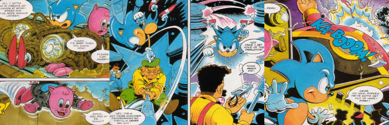 “Casino Night” continues in the next issue, picking up right where the first part left off and, thankfully, sparing us any flashbacks or wasted time recapping the previous events. StC was great like that; they just did the smallest text box or a bit of dialogue and that was it. Another thing it was good at was painting Sonic as an absolute prick; like, he was heroic and brave and all that, but Goddamn was he an abrasive, self-absorbed, egotistical bully sometimes. Mostly, he threw his insults at Tails, but he wasn’t above tormenting Porker either, and he does that in this issue, driving the poor pig into a panic by pretending like they’re doomed to die. After getting his kicks from Porker’s abject terror, Sonic vibrates the ropes that bind them at super speed and breaks them free seconds before their gruesome demise. Spotting the Marxio’s nearby, now in possession of the disruptor device, Sonic pursues them into the nightmarish pinball machine that functions as the heart of the Casino Night Zone and runs rings around them as they try to smash and bash him with their metal pole…things (a weapon Sonic’s ill-fated ally, Johnny Lightfoot, would later take as his own). Although Grouchio smashes the device, Sonic is far from perturbed; in fact, he was simply stalling for time to allow Porker to reprogram the Casino Night’s main computer and cause all of the machines to pay out bucketloads of cash. As an exclamation point, Sonic has Porker destroy the head of Dr. Robotnik’s statue, disrupting his hypnotic rays and delivering a decisive victory in the ongoing war against the egg-shaped tyrant.