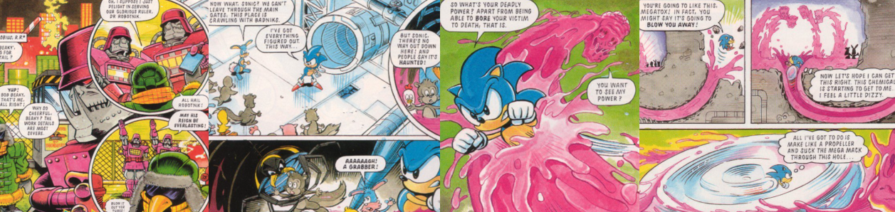 After a two-issue gap, StC tapped into Sonic 2 for inspiration for one of the most memorable stories of the comic for me, “Megatox”. This one has special meaning to me as, when I was a kid, before we could afford to buy StC on the regular, I only had two issues; one was issue two, and one was issue ten, so I read “Megatox” to death back in the day. By this time, Dr. Robotnik has overtaken Mobius thanks to taking advantage of a time dilation a few issues back; his Badniks and military Troopers are everywhere and Sonic and his friends have been forced on the run in disguise as Bob Beaky’s traveling circus. This is why Sonic infiltrates the Chemical Plant Zone dressed in a massive snow suit and hat and pretending to be Bob Beaky, loyal servant of Dr. Robotnik’s; this allows him to get into the toxic facility, where Troopers are working woodland critters to exhaustion and disciplining them with energy whips. Disgusted at the Trooper’s mistreatment of innocent Mobians, Sonic quickly abandons his disguise and trashes Dr. Robotnik’s goons; since they don’t use animals as power sources, Sonic doesn’t have to worry about holding back and literally bursts through them to lead a desperate escape attempt through a tunnel full of a strange, pink, toxic gunk. Although Sonic gets the critters to safety (and even frees another from a Grabber), he’s startled when the toxic gunk (known as “Mega Mack”) suddenly comes to life and attacks him, assuming a sentient, corporeal form called Megatox. Once a scientist charged by Dr. Robotnik to create a poisonous chemical to kill Sonic, he was transformed into living Mega Mack after a freak laboratory accident and wastes no time in fulfilling his objective by choking and poisoning Sonic with its toxic body. Already feeling the effects of the poison, and unable to directly attack Megatox since it is essentially living water and incapable of being destroyed through conventional means, Sonic instead burrows through the ground and disperses Megatox all over the countryside (no doubt indirectly polluting the nearby environment in the process) using a vortex, ending the strange creature’s threat…for a time.