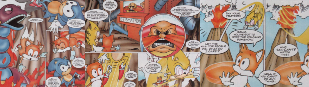 Super Sonic made a return in the very next issue, which took place at one of my favourite Sonic 2 Zones, the Hill Top Zone. “Hill Top Terror” sees Sonic and Tails assist a small village at the base of an active (and very close to erupting) volcano. Before landing, Sonic has to take out a small group of Turtloids, oddly seeming to fly at superspeed and then observing that he can’t actually fly and needs Tails to rescue him with his biplane (which earns the two-tailed fox what can be loosely called a compliment). Sonic and Tails meet the bird-like tribe and their leader, Chief Kordon, who explains that the Mountain of Destiny threatens to wipe them out, claiming it to be the wrath of the Gods, which Sonic dismisses with a casual flippant comment. Racing to investigate, Sonic and Tails are surprised by a Rexxon dwelling in the boiling lava of the mountain; with Tails struggling to keep them from falling to their deaths, the stress of the situation causes Sonic to transform into his demonic other half once more. After taking his anger out on the Badnik, Super Sonic is left hungry for something to destroy and therefore unimpressed by Dr. Robotnik’s seismatron, which causes the volcano to violently explode and spells doom for the village. Thankfully, Tails hitches a ride out of there on Super Sonic’s leg and then manipulates the malevolent creature into stopping the volcano by questioning his power and ability. The effort of creating a “Super Sonic fan to cool the lava” is enough to not only save the villagers from a horrible death but also to return Sonic to normal; though he has no memory of his time, actions, or the threats he made towards Tails as Super Sonic, just enough of his personality remained to carve an effigy of himself on top of the mountain for the villagers to admire.