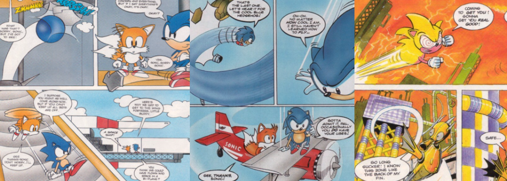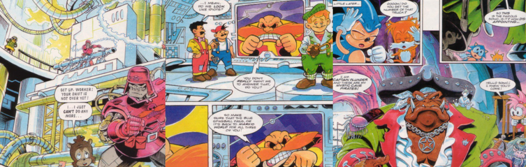 Like basically all external Sonic media, StC was rife with original characters; many, especially those in Sonic’s gang, were adapted from the Mobius lore but others, like Captain Plunder, were a little more surreal and yet fit quite well with this version of Sonic’s world. Few of them make much impression in these stories beyond Captain Plunder and, I guess, the Marxio Brothers for being parodies of SEGA’s rival, Nintendo. One thing you may notice is that Dr. Robotnik doesn’t show up much in these stories and Sonic doesn’t actually fight him directly; this was actually quite common, especially after Dr. Robotnik took over Mobius and became virtually untouchable, and much of the ongoing story was about striking victories and disrupting his operations, not unlike what we saw in SatAM, casting Sonic firmly as the underdog despite him always coming out on top. For those who were hoping to see a traditional Zone-by-Zone adaptation or a bigger, more dramatic showdown on the Death Egg, these stories will probably be a disappointment; indeed, the Death Egg wouldn’t be properly explored or seen as a real threat until later, after Knuckles’ introduction, so I can understand why “Attack on the Death Egg” might fall a little flat in that regard. Still, I think these stories collectively do a decent job of capturing some of the essence of Sonic 2 and recontextualising the Zones and gimmicks into something that would actually work as a living, real place. Many of the elements seen in these stories would return in later issues, with Captain Plunder, Megatox, and the Marxio Brothers becoming recurring villains and anti-heroes, and basically all of Super Sonic’s unique characterisation as this out of control, destructive force was established here. Naturally, there’s a lot of bias on my part; I grew up reading these stories and was an avid collector of StC and really enjoy how they adapted the source material into something recognisable, but still distinctive in its own right, and I definitely think their efforts to incorporate and expand upon Sonic 2 resulted in some fun and visually engaging stories here.
