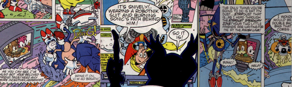 Naturally, Sonic wants to leap into action right away; determined to prove himself and to rescue one of his greatest fans, he thinks nothing of jumping head-first into such an obvious trap, such is his confidence. However, Knothole is a democracy and, as a result, he’s forced to heed to Sally’s more level-headed orders; to get a better sense of what dangers lie ahead, Sally has Miles “Tails” Prower fly on ahead to scope out the area…and he’s immediately captured by Dr. Robotnik’s Swatbots. Fed up with waiting, Sonic races out to the Zone portal and, despite Dr. Robotnik struggling with his lines, is brought abreast of the escalating hostage situation; thanks to the Sonicam’s slow-motion function, Sally and Rotor are able to look in as Sonic races through the bizarre environment while Snively incinerates the path behind him, all to force Sonic into a confrontation with Mecha-Sonic (also referred to without the hyphen). Oddly, Mecha-Sonic’s dialogue seems to indicate that the two have met before, but this was the character’s first appearance; however, it wasn’t uncommon for the videogame’s events to happen off-panel and between stories throughout Archie’s run, even though that doesn’t really align with the narrative presented here, making this allusion confusing, at best. Anyway, Mecha-Sonic challenges his rival to prove his speed in a race through the Stardust Speedway Zone, with Tails and Amy as the prize and Snively pursuing them in Dr. Robotnik’s craft