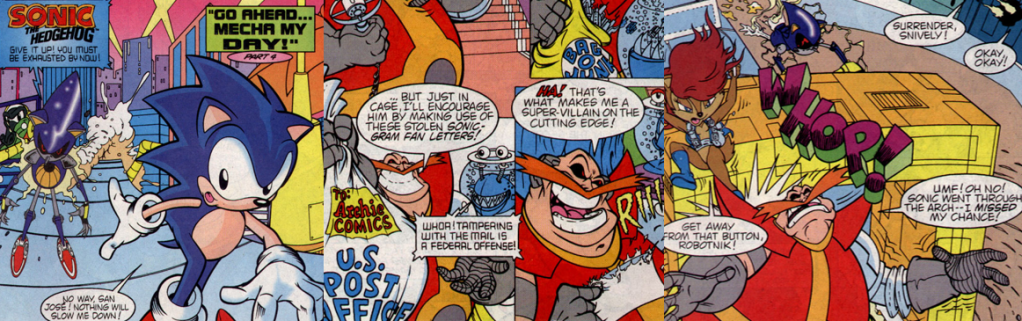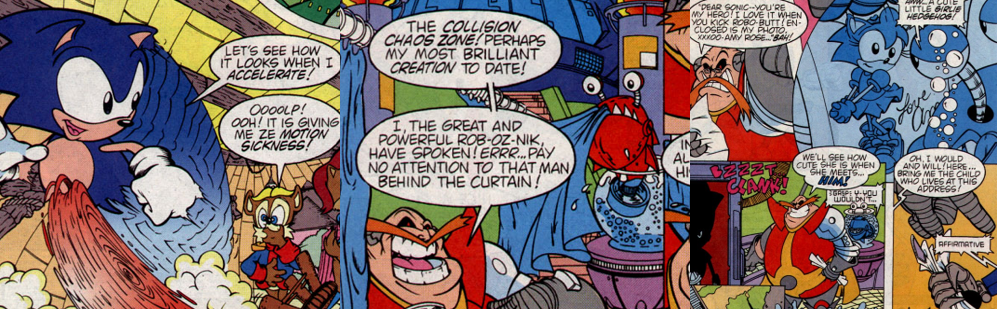 “Go Ahead…Mecha My Day!” (great pun, by the way) begins with Sonic impatiently enduring the hooking up of a video camera to his sneaker; developed by Knothole’s resident mechanic and tinkerer, Rotor the Walrus, the “Sonicam” sends a direct feed back to the Freedom Fighter’s computer so they can keep track of where Sonic is and any potential dangers they need to be aware of. Princess Sally Acorn, leader of the Knothole Freedom Fighters, is particularly pleased with this new technology given that a “new Zone portal” just opened up and is in need of exploration. Sally’s fears about this situation are well founded as it turns out that the Collision Chaos Zone is the creation of Mobius’s mad cybernetic dictator, Doctor Robotnik. However, while he looks like the SatAM Dr. Robotnik, at this point Archie’s version still has quite a bit of his bombastic and foolish variant from the Adventures of the Sonic the Hedgehogcartoon (1993); this means he breaks the fourth wall, chuckles maniacally to his bumbling Badniks, and lacks the grim menace of the SatAM version. However, there’s enough of that interpretation of the character in Dr. Robotnik to order his latest, most mysterious creation to kidnap Sonic’s number one fan, Amy Rose, and then issue a direct challenge to Sonic, daring him to test his speed and skill in his Collision Chaos Zone to rescue Amy. Naturally, Dr. Robotnik plans to stack the deck against Sonic by having his long-suffering, snivelling nephew and head minion, Snivley, struggle into an elaborate Robotnik costume and burn up the road behind Sonic to force him into an even deadlier trap.