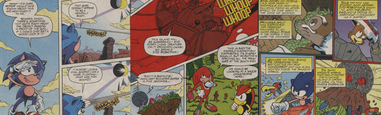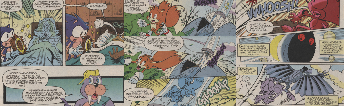 As best as Knothole’s resident physician, Doctor Horatio Quentin Quack, can figure, this is a result of the King’s extended stay in the mysterious Zone of Silence; in order to keep the Freedom Fighters from panicking, King Acorn’s condition has been deemed top secret and Sally orders St. John to stand guard over the King while they explore their options. Their trusty mechanic and science expert, Rotor the Walrus (occasionally called “Boomer”), is at a loss but rookie Freedom Fighter Miles “Tails” Prower hits upon a possible solution when he observes that the King’s crystalline skin resembles the texture of Chaos Emeralds. This prompts Sonic to retrieve his recently-acquired “one-billionth Magic Ring” to try and use its Chaos Emerald powers to reverse King Acorn’s condition, though it proves to be a fleeting solution. Rotor theorises that the Ring is unique to Sonic and suggests gathering as many others as possible to try again, prompting Sally to send Bunnie Rabbot and Antoine D’Coolette out to the mysterious Lake of Rings in the forest and Sonic and Tails to the Ring Grotto outside Robotropolis, Dr. Robotnik’s industrial, mechanical city. This area has been irrevocably changed and damaged following a recent fight between Super Sonic and Hyper Knuckles, and Dr. Robotnik’s attacks, and the two are stunned to find the Ring Grotto has been sealed beneath an impenetrable steel dome. Sonic leaves Tails to watch over the area while he races off to recruit a bruiser named Carl Condor to help bust it open, and the young fox-boy is shocked when the dome suddenly opens up and the Grotto’s entire supply of Magic Rings is sucked up into the clouds courtesy of a giant vacuum tube, which also takes Tails along with it! At the Mobian Cliffs, Sonic is shocked by a sudden and unnaturally faster solar eclipse, almost as if something artificial were crossing the Sun’s path, and horrified to find that Carl has been robotocised; caught off-guard, Sonic is rendered unconscious by the mechanical vulture and carried into the sky towards an ominous, egg-shaped superstructure.