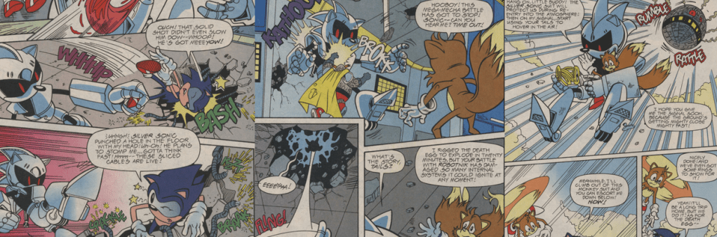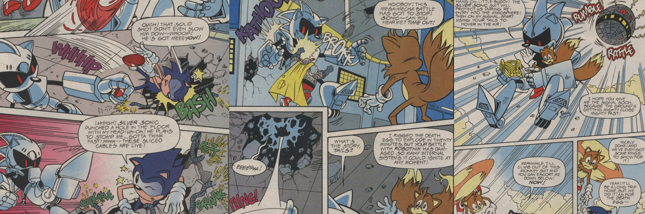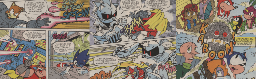 Naturally, Sonic leaps into action, only to end up attacking Tails by accident. To make matters worse, Dr. Robotnik shields himself from Sonic’s attack with a thick wall of plexiglass and then chokes him out with a spew of poisonous gas. Luckily, Tails recovers from his assault and uses his SWATbot suit to break through Dr. Robotnik’s defences and destroy his control panels, saving Sonic from suffocation and sending the satellite uncontrollably hurtling into space. Thanks to a “stabilising field” built into his “Gravi-Gauntlet”, Dr. Robotnik staves off the sudden drag of inertia and escapes to his auxiliary control room; he then sics a massive robotic Sonic doppelgänger on the two. While a far cry from his sleeker, more popular counterpart or even Sonic’s more versatile Mecha Sonic form, this “Silver Sonic” has the muscle and armour to shrug off Sonic’s attacks and manhandle (or should that be hoghandle?) him with punches, kicks, and slams but proves disappointingly susceptible to an electric shock from some conveniently-placed severed cables. Despite the failure of his Silver Sonic, Dr. Robotnik resorts to another back-up plan, donning his “most sophisticated battle armour ever”, the Eggs-O-Skeleton, which augments his physical strength by drawing power from the Death Egg itself! Sonic evens the odds by (…somehow…) commandeering Silver Sonic’s mechanical body and battling the rotund dictator on equal ground. The melee escalates but, ultimately, Sonic hurls Dr. Robotnik up through the ceiling and out of the Death Egg; during the fight, Tails was somehow able to rig the Death Egg to explode and the two beat a hasty retreat, swiping the stolen Magic Rings and making it safely to the surface before the Death Egg’s destruction (which, while somewhat anti-climactic on paper, is “seen and felt” all around the planet). While Snively faces the wrath of his uncle and master and the mad cyborg swears revenge upon Sonic and the Freedom Fighters, Sonic and Tails race back to Knothole to see if the Rings will cure the King, which is a plot thread left unresolved in this miniseries.