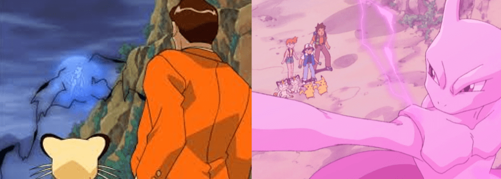 Unlike Jesse, James, and Meowth, Domino is portrayed as a capable and conniving member of Team Rocket; not only does she identify Mewtwo’s location, she successful fools all of the characters with her disguise as Cullen’s assistant and she commands the Team Rocket Combat Unit, a feat that Jesse, James, and Meowth are incredibly impressed by. Her reputation as the “Black Tulip” and authority make her a pivotal agent of Team Rocket; she’s embarrassed by the trio’s slapstick antics, is instrumental in Giovanni’s campaign against Mewtwo, and is absolutely reprehensible in her capture of the clones using her electricity-spitting tulips. It’s refreshing to see Giovanni playing such an integral role as the overall antagonist; a scheming, manipulative mastermind, Giovanni wields incredible power from behind the Team Rocket Combat Unit. He’s easily able to disable the clone Pokémon with red energy bolts, briefly capture them in special Team Rocket-branded PokéBalls, and is even able to force Mewtwo into submission by threatening the safety (and lives, in a surprising inclusion) of its clone Pokémon and the sanctity of Clarity Lake. Giovanni’s machinery threatens to bend Mewtwo to Giovanni’s will and almost kills it but, thanks to the intervention of a horde of Bug-type Pokémon (who show up to oppose the ridiculously fast construction of Giovanni’s base and his polluting of the lake) and the protagonists, and the restorative properties of Purity Lake, Mewtwo is saved from brainwashing and death and returns full force to enact its revenge.