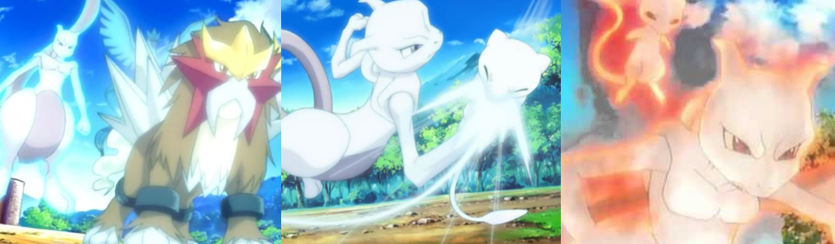 Horrified at Pikachu’s suffering, Oak reluctantly gives over his password, allowing the Mirage Master to hijack every Pokémon database around the world and giving birth to his ultimate Mirage Pokémon: Mirage Mewtwo (Katsuyuki Konishi). Rather than being the same Pokémon Ash encountered before, Mirage Mewtwo is an all-powerful creation of the Mirage System, one incapable of telepathic communication but boasting every Pokémon attack available. Not only is the Mirage Master revealed to be Dr. Yung in disguise and out for revenge after his research was disregarded due to his immoral attitude towards Pokémon, he also extends the Mirage System outside of the Mirage Mansion using a series of missiles and recreates Mirage versions of Entei, Articuno, Zapdos, and Moltres. Naturally, the heroes’ Pokémon are no match for the Mirage Legendary Pokémon, much less Mirage Mewtwo; not only can it destroy other Mirage Pokémon in a single attack, it makes short work of even Professor Oak’s Dragonite (Unknown) by unleashing powerful attacks such as Flamethrower and Hyper Beam. Mirage Mew comes to their aid, shielding them from Mirage Mewtwo’s attack, but is ultimately overwhelmed and disintegrated by Mirage Mewtwo’s attack. Dr. Yung then downloads all of the Mirage Pokémon data into his Mirage Mewtwo, causing tumorous lumps to pop up all over its body and a range of powerful attacks to be unleashed all at once. Right as Mirage Mewtwo is poised to finish off the heroes, Mirage Mew remerges from the Mirage System (and within Mirage Mewtwo’s body) and exerts its control over Mirage Mewtwo, holding it in place so that Pikachu can destroy it with a Volt Tackle. Sadly, Mirage Mew is also destroyed along with its malevolent counterpart, and the entire Mirage System; Dr. Yung refuses to surrender, however, and disappears into the flaming rubble and explosions of his Mirage Mansion and is presumed to have perished alongside his research. In the aftermath, Ash and his friends thank the efforts of the Mirage Mew and condemn Dr. Yung’s immoral nature, before resolving to continue on their journeys.