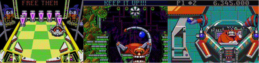 Graphically, Sonic Spinball is a mixed bag. The environments look good; every stage is large and detailed and pops with 16-bit goodness. The SatAM-style sprites are serviceable enough but Sonic looks really weird; he’s very squat and out of proportion when not curled into a ball. Things get pretty impressive in the bonus stages, where you see Sonic’s reflection as he controls a real pinball across a giant table, smashing Scratch’s and the Badnik processors to free his furry friends. The game mostly impresses with its music, with memorable tunes punctuating the frustrating and chaotic action. It may lack all the traditional Sonic tunes, but that Toxic Caves theme is an earworm, for sure. Every stage culminates in a boss battle at the very top where your biggest threat is screwing up your momentum and dropping out of the arena. Sonic can’t be hurt or killed by the bosses, but you must aim your shots to deal damage, which gets trickier with each boss. Things start [pretty simple with Scorpius; simply avoid the sewer warp tube and the acidic gloop it spits and flip Sonic into the sweet spot between its tail and its back to clobber it. The Robo-Boiler is a little trickier as you must flip up to a temporary platform on either side and time your jump to avoid the steam vents and smash the Robotnik faces floating inside, though it’s very easy just to fly all over the place. The Veg-O-Machine was another tricky one since it constantly spews Badniks and you must target the tubes on either side to halt their production before finishing it off from the inside. You finally confront Dr. Robontik aboard his ship as he flees the crumbling Veg-O-Fortress. This is the most aggravating fight of the game as Dr. Robotnik is shielded by claw arms and windsocks, which must be deactivated by hitting the button beneath his cockpit. Fail and you could be dropped to the beginning of the stage! However, even when you do deactivate the obstacles, you have only a short window to land hits, making this a tedious final fight. Despite all those Chaos Emeralds, beating the game only earns you a high score for the table and there’s nothing else to come back for. You can use cheat codes to skip ahead or the rewind and save state functions of other ports to make the game easier, however.