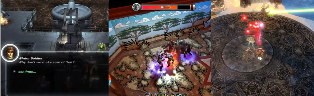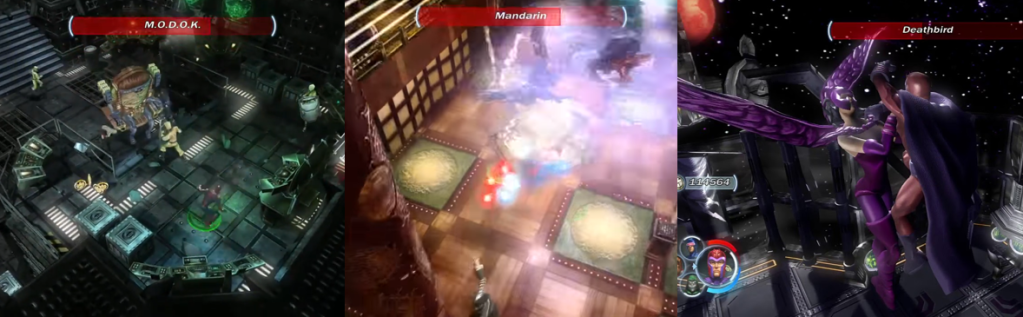 Avengers Tower is then attacked by Ultron and his drones, who assist him in battle. Not that he needs it as the Mind Stone allows Ultron to mess up your controls, to say nothing of his signature face and palm beams. Ultron then grows to gigantic proportions, sweeping the area with his eyebeams before Clint Barton/Hawkeye intervenes and Ultron merges with Ultimo. This is the first giant boss battle in the game and sees you blasting Ultimo with cannons and avoiding his massive swipes. The Infinity Sentinel is comparatively smaller, but no less dangerous thanks to its own face beam and missiles. Though you can damage it with Sentinel cores, it’s finished in a cutscene by Erik “Magnus” Lehnsherr/Magneto, who then tosses debris and throws you off balance with magnetic pulses while Juggernaut pummels you and Raven Darkholme/Mystique tosses daggers. After surviving Mystique’s Danger Room trials, you face Magneto, now even tougher thanks to the Power Stone, before being chased away and banished to the Dark Dimension by the Black Order. There, you battle past Loki Laufeyson (who boasts elemental attacks and duplication tricks) to eventually face the dread Dormammu, who wields the Reality Stone and is the second giant boss. You must subdue his minions and avoid his flame bursts, whittling down his magical barrier either directly or be destroying three nearby orbs, all while dodging his giant fists and ground spikes. The brief fight with Maximus Boltagon is far easier, even though the mad Inhuman carries a massive energy cannon and you must take cover in Thane’s energy bubble to avoid Maximus’s barrage of lasers. Ulysses Klaue/Klaw awaits in Wakanda and his sound-based energy blasts and waves must be overcome to rescue and recruit James Buchanan “Bucky” Barnes/The Winter Soldier. You then fight past A.I.M. to confront their master, George Tarleton/Mental Organism Designed Only for Killing (MODOK), who uses the Soul Stone to turn the Dora Milaje against you and attacks with a slew of appendages, from buzzsaw arms, poison gas, failing tentacles, and his signature forehead blast.