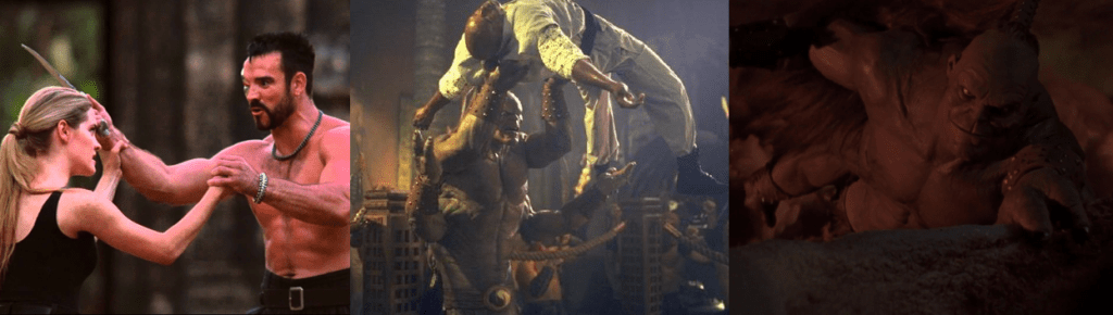 While the visual effects are often cartoonish, they’re clearly secondary to more traditional displays of martial arts and stunt work. Although the actors partake in each episode’s fights as much as possible, with Bruce Locke and Daniel Bernhardt putting in more of the work (thanks, largely to the latter’s unique stature and legitimate martial arts background), obvious stunt doubles are used for each fight, with Kristanna Loken noticeably being supplanted. While it’s jarring to edit close ups of the actors to sell the illusion, the fights are very well choreographed, with Christopher Leps, Marcus Young, J.J. Perry, and others bringing a grace and tactile believability to each. The battle between Kung Lao and Shang Tsung reflects the animosity between the two, with Shang Tsung growing increasingly frustrated and Kung Lao exuding the speed and precision that made him Earthrealm’s finest. Even when saddled with perhaps the fakest sword I’ve ever seen, Daniel Bernhardt shines, largely because you recognise that the actor is performing many of his stunts and fights. Siro isn’t as slick and graceful as Kung Lao but exudes physical power, having great reach with his kicks (his flying kick being particularly impressive), even if he is out of his depth against more otherworldly opponents. Though she lacks Kung Lao’s skill and Siro’s raw power, Taja is a scrappy fighter who uses underhanded tactics and is seemingly fearless. Kung Lao’s battles with Scorpion are an obvious highlight, with Casamassa bringing an aggression to Scorpion that paints him as a force to be reckoned with, even more so when tossing his snake-like appendage about (not a euphemism). It’s good that the action is so impressive as the drama between Kung Lao and Jen really drags these episodes down, largely because they lack chemistry and Renton’s awful performance. The sting of these scenes is eased by Meek’s theatrical performance as Shao Kahn, his dry sense of humour as Rayden, and a fun energy to the episodes. I got the sense everyone was having a good time and trying their best to start something, and the framework is definitely here, it would just take a few episodes to be as good as it could be.