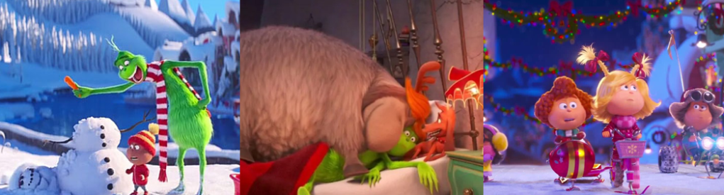 As is to be expected from Illumination, The Grinch looks fantastic. There’s an adorable aesthetic to the entire film that makes it very appealing and the animation is much more suitable to Dr. Seuss’ unique art style, which frankly looks horrific in live action. Cindy Lou was especially adorable, easily melting the Grinch’s heart with her big, expressive eyes and pure-hearted plea, but I also enjoyed how colourful and lively Whoville looked. Although the Grinch isn’t said to have superhuman strength like in the live-action version, cartoon logic and physics make him incredibly durable and allow him to perform bizarre feats like lugging around a massive, overloaded sleigh and muscle his haul to safety after his change of heart. Surprisingly, The Grinch omits the traditional “You’re a Mean One, Mr. Grinch” during his malicious scheme (which also sadly lacks him gobbling up Christmas presents). Whoville still sing their usual Christmas melody, “Welcome Christmas” around their gigantic tree, but the film’s more likely to use traditional Christmas carols than original songs, though I did like the use of “Zat You Santa Claus?” by Buster Poindexter and His Banshees of Blue. The Grinch is depicted as more of an inventor, though sadly this is mostly offscreen and comes quite late into the film. He cobbles together extending shoes and grappling hooks for himself and little mech suits for Max, which help him to steal Christmas in record time. I would’ve liked to see the Grinch tinkering away with some of these inventions throughout the film or using some tech to try and wrangle reindeer rather than a simple horn and a lasso.