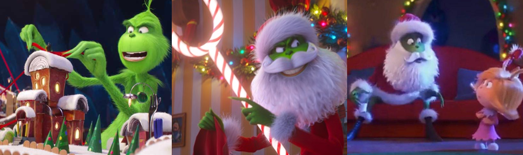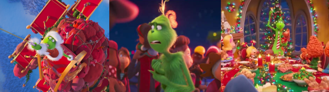 As is to be expected from Illumination, The Grinch looks fantastic. There’s an adorable aesthetic to the entire film that makes it very appealing and the animation is much more suitable to Dr. Seuss’ unique art style, which frankly looks horrific in live action. Cindy Lou was especially adorable, easily melting the Grinch’s heart with her big, expressive eyes and pure-hearted plea, but I also enjoyed how colourful and lively Whoville looked. Although the Grinch isn’t said to have superhuman strength like in the live-action version, cartoon logic and physics make him incredibly durable and allow him to perform bizarre feats like lugging around a massive, overloaded sleigh and muscle his haul to safety after his change of heart. Surprisingly, The Grinch omits the traditional “You’re a Mean One, Mr. Grinch” during his malicious scheme (which also sadly lacks him gobbling up Christmas presents). Whoville still sing their usual Christmas melody, “Welcome Christmas” around their gigantic tree, but the film’s more likely to use traditional Christmas carols than original songs, though I did like the use of “Zat You Santa Claus?” by Buster Poindexter and His Banshees of Blue. The Grinch is depicted as more of an inventor, though sadly this is mostly offscreen and comes quite late into the film. He cobbles together extending shoes and grappling hooks for himself and little mech suits for Max, which help him to steal Christmas in record time. I would’ve liked to see the Grinch tinkering away with some of these inventions throughout the film or using some tech to try and wrangle reindeer rather than a simple horn and a lasso.