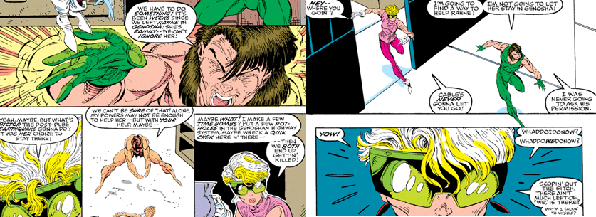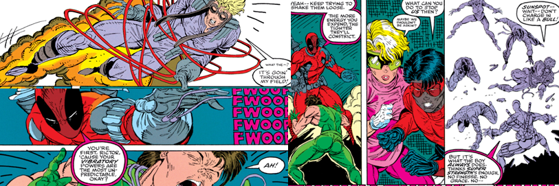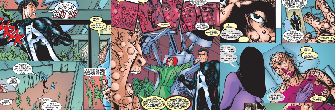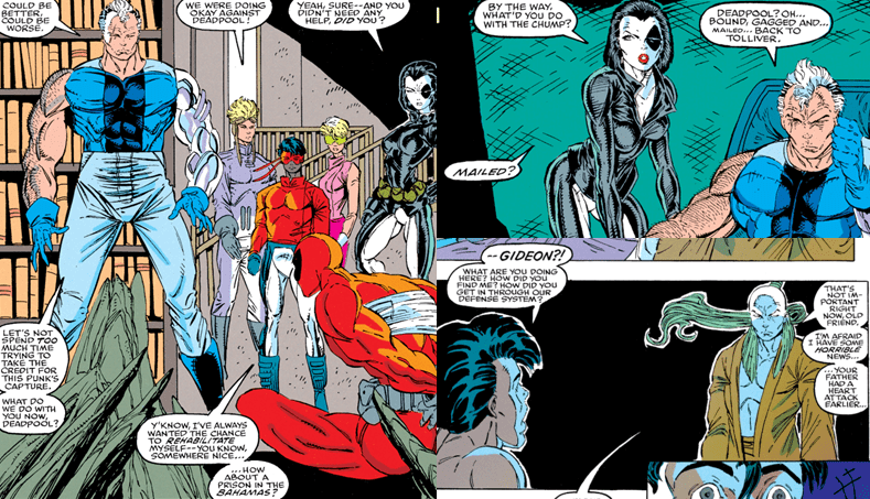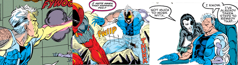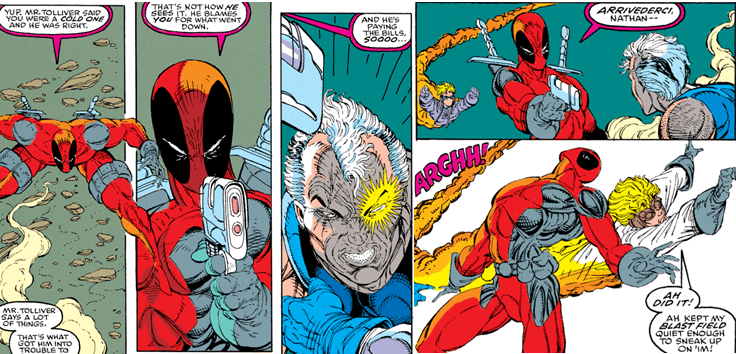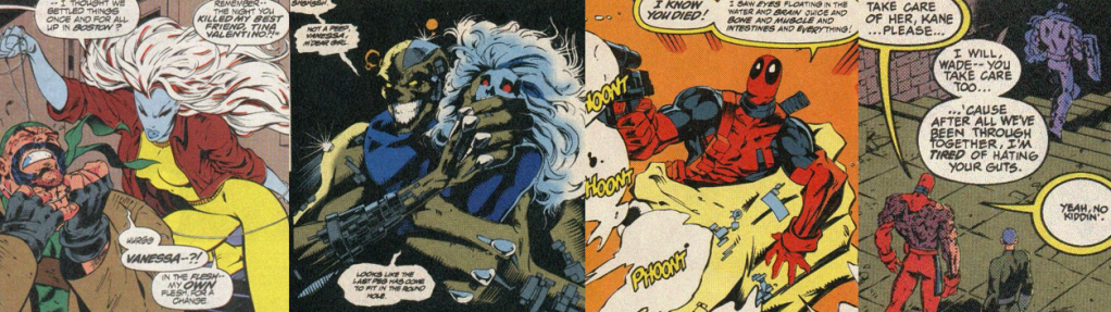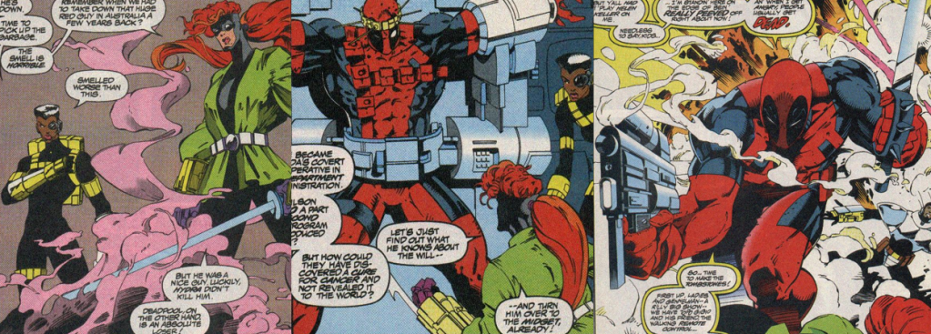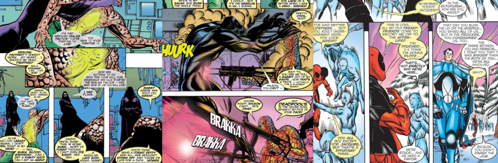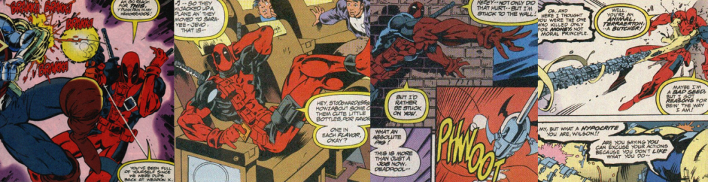I think what lets this miniseries down is the main villain. I’m vaguely aware of Black Tom but he’s a bit of a nobody, with weak-ass powers that can’t compare to Deadpool’s skills. Luckily for him, he’s got the Juggernaut in his pocket but, even then, Cain is just a rampaging brute and fights against him aren’t that interesting. Nothing Deadpool and Siryn throw at the Juggernaut can stop him and they’d been ridiculously outmatched even if Deadpool’s healing factor was working. Without it, we’re denied even the simple pleasure of seeing the Juggernaut tear Deadpool limb from limb and instead rely on a cat-and-mouse game. This is fun enough and shows Wade’s adaptability and certainly paints Siryn as formidable since she holds her own against the Juggernaut, but I feel more could’ve been done with these bouts. Instead, the story spends more time focusing on Danny Peyer and his childish vendetta against Deadpool for costing him his career some years ago. Peyer is just a regular guy with a gun and some soldiers; he’s way out of his league and just grinds the story to a halt. I would’ve rather seen Banshee simply pulling Interpol’s file on Black Tom and then devoted the panels wasted on Peyer to showcasing more of the Deadpool/Juggernaut fight and exploring Wade’s condition, especially as a mirror of Black Tom’s. Like Deadpool, Black Tom suffers from an affliction that’s slowly and painfully killing him (or transforming him into a tree-man? I’m not sure). His agony and desperation see him lash out and devolve into near madness after grafting Wade’s severed hand to his own, increasing his powers and finally making him a true threat but, in the end, he’s subdued with ridiculous ease because, as I said, Black Tom is a nobody. In the end, this was an okay miniseries for the Merc with a Mouth; it showcased a few more layers to his character and developed him further into the near parody of a character we know today, but it’s really just nonsensical fights. Every conversation is interrupted by some goon or another, it’s not always clear what’s happening or why, and the threat is just so low level that it feels like Deadpool could’ve ended things in one or two issues if his healing factor wasn’t mysteriously broken.