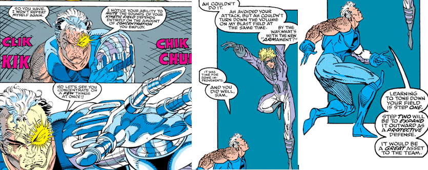 This ties into a recurring theme in this miniseries concerning Deadpool’s self confidence and his monstrous lifestyle. When we first see him, he scares off patrons with his scarified visage and he reacts with hostility whenever Siryn tries to remove his mask, before descending into Walter Kovacs/Rorschach levels of madness when it’s finally removed. He expects Siryn to react with fear and disgust, but is amazed when she shows him pity. In recounting his origin, Deadpool talks bitterly about how his terminal cancer was cured at the cost of his humanity, and he turns that bitterness and anger towards the world (or, at least, his enemies), masking his pain with a mile-a-minute banter that regularly antagonizes friend and foe alike. I’m not sure why, but Deadpool’s healing factor is on the fritz in this miniseries. It leads to some dramatic tension as Deadpool’s strategy is to throw himself head-first into a fight, shrugging off mortal wounds and coming out on top, something that costs him his hand and leaves him struggling to heal from wounds. As far as I can tell, it’s not said why this is happening to him and it is a bit inconsistent: Deadpool’s momentarily stunned from a gunshot wound but shrugs off a plummet from a window. His reflexes and skills are also unaffected by this handicap, though it does place him in a more vulnerable position and allow him to open up to Siryn and, perhaps, rediscover aspects of his humanity. Deadpool’s reputation precedes him, to the point where Banshee is reluctant to team up with him and warns Siryn against getting too attached to him since Wade is known as a cold-blooded mercenary who’s just as likely to stab them in the back as help them. However, Deadpool is clearly taken by Siryn, either legitimately or from simple lust, and not only accompanies them to Bannerman Castle despite being wounded but even temporarily forgets his own selfish desire to be cured to help Siryn when she’s manhandled by Black Tom. Deadpool’s really off his rocker here, ranting about nonsense during pitched battles and mocking his foes to throw them off-balance, overwhelming even groups of armed soldiers with his katana and guns. Though he’s no match for the Juggernaut, that doesn’t stop him trying and standing up to the brute, though this miniseries emphasises quite explicitly that much of his inane banter is to mask the pain and anger he feels at being turned into a ghastly, inhuman freak.