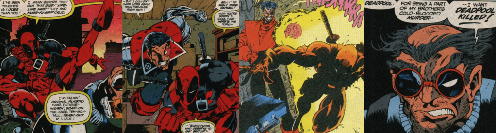 By the 1980s, the X-Men had been established as one of Marvel Comics’ most successful publications and then-chief editor Jim Shooter was encouraged enough by their success to commission a few spin-off titles, birthing Chris Claremont and Bob McLeod’s New Mutants. These Mutant youngsters soon fell under the tutelage of the time travelling Mutant Nathan Summers/Cable, formed X-Force, and famously clashed with Fabian Nicieza and Rob Liefeld’s Deadpool in The New Mutants #98 (ibid, 1991). Heavily inspired by James Howlett/Logan/Wolverine, Peter Parker/Spider-Man, and (most infamously) to DC Comics’ Slade Wilson/Deathstroke the Terminator, the self-styled “Merc With a Mouth” proved popular enough to receive this own four-issue miniseries in 1993. The series was a relative success, prompting Marvel to sign off on a second miniseries the following year, though writer Mark Waid later distanced himself from the character’s more violent nature. This was all a prelude to Deadpool graduating to an ongoing solo title and his greater popularity as a self-aware anti-hero, and his eventual appearances in Marvel/X-Men-related videogames, a cameo appearance in the beloved X-Men animated series (1992 to 1997), and the incredible success of his live-action feature films decades later.