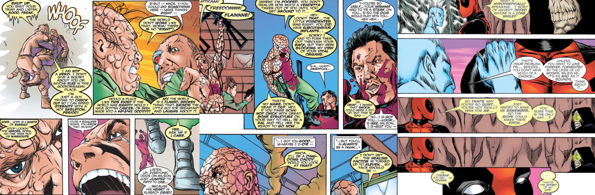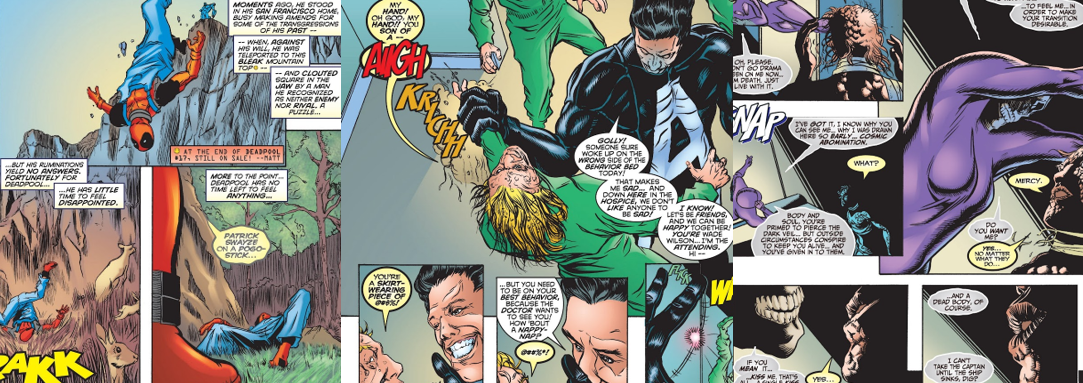 Deadpool’s second miniseries begins in a secret, heavily guarded facility where two thousand imprisoned inmates are forced to endure the agonised screaming of Thomas Cassidy/Black Tom as he sustains horrendous torture at the hands of Doctor Emrys Killebrew. Dr. Killebrew’s there to cure Black Tom of the “viral wooden growth” currently infecting his cellular structure, a procedure quickly interrupted by the explosive arrival of Cain Marko/The Juggernaut, Black Tom’s loyal (if thick-headed), brutish best friend. Though weak and in pain, Black Tom ensures the Juggernaut also grabs Dr. Killebrew and his files on cellular regeneration cases, namely one belonging to Wade Wilson. Weeks later, everyone’s favourite Merc with a Mouth is regaling patrons in a bar with stories of his recent tangle with Wolverine, removing his bandages and scarring off a girl with his tumour-riddled, scarified visage. As he downs beers, Wade shares a truncated version of his origin with the bartender, too busy dwelling on his situation and running his mouth to notice when a group of heavily armoured and well-armed mercenaries enter the bar. Though blasted by a bazooka, Wade easily recovers thanks to his advanced healing factor and opens fire, antagonising the mercs with his inane banter, though briefly slowed by a particularly gruesome close range shot to the gut. Too stubborn to go down, Deadpool continues to fight back; even being literally frozen doesn’t keep him down thanks to the unexpected arrival of Sean Cassidy/Banshee and his daughter, Theresa/Siryn, who catches Deadpool’s eye as much as their mention of Black Tom catches his attention. Since Black Tom is Banshee’s cousin, he has a vested interest in tracking him down and has been on his trail since his escape, though neither of the Irish Mutants know why their cousin targeted Deadpool. For Wade, it’s as simple as revenge since he’s tangled with Black Tom before, though all three are confused as to why Black Tom would order for Deadpool to be captured alive rather than simply ordering his assassination. On Siryn’s suggestion, Banshee reluctantly leaves to get some answers from Interpol and she chooses to stick close to Deadpool, sure that Black Tom’s goons will strike again, and immediately shuts down his lewd attempts to woo her.