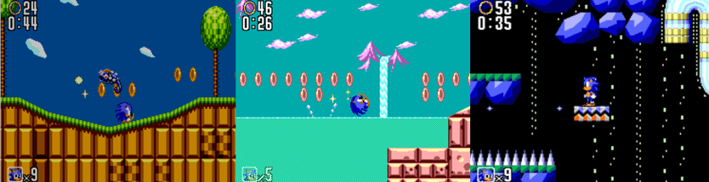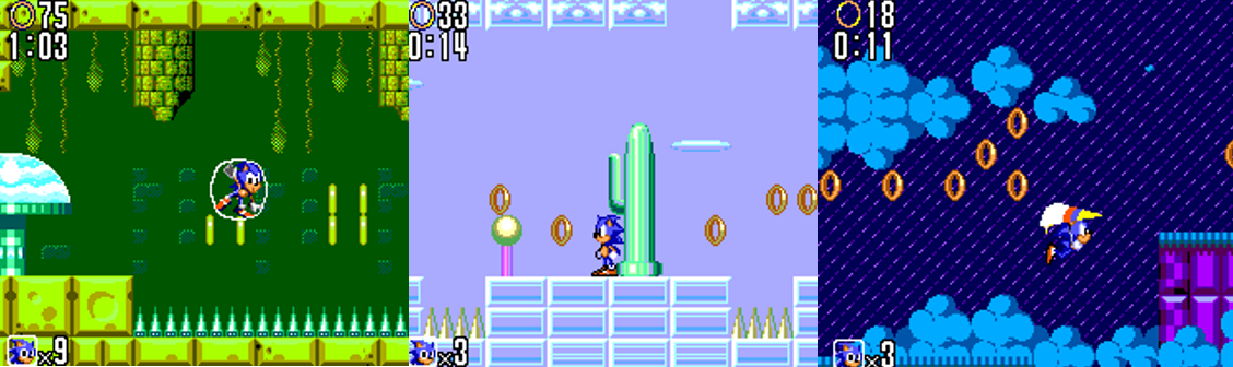 Rather than taking on Dr. Eggman in Act 3 of every Zone, you’ll instead have to battle the mad scientist’s six “Master Robots”, which each one appearing as a large, mechanical creature. As before, you’ll have to navigate through a few obstacles to even reach the boss without the aid of any Rings, which can be a pretty tall order when spikes and hazards are much more prominent this time around. Indeed, Dr. Eggman even inexplicably saves you from an unavoidable dip in lava to force you into battling the Antlion Mecha, a mechanical beetle that waits for you at the bottom of a steep slope. To defeat the Antlion Mecha, you have to jump over or avoid the bombs that bounce in from the left side of the screen so that they damage the boss instead of you. This is much easier said than done thanks to the slippery slope and the Game Gear’s reduced screen size; also, Dr. Eggman will rush in to try and ram you near the end so be sure to hop over him. The Goose Mecha requires a lot less strategy; it drops little Mecha Hiyoko around the clouds that you must take out and then bobs around the arena shooting projectiles at you. Simply ram it in the head and avoid getting hit and it’ll go down pretty easily.