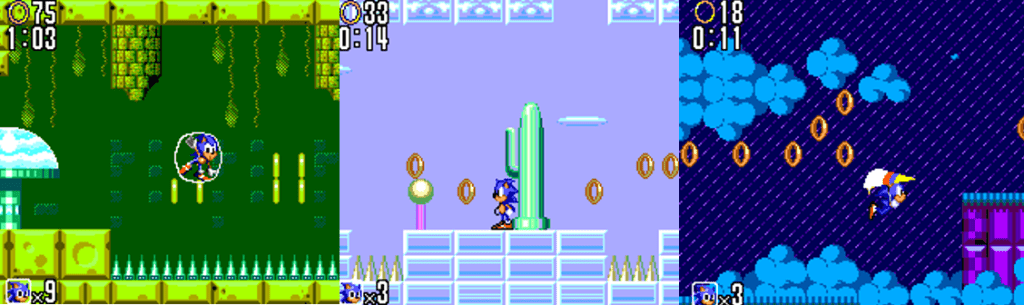 The game’s Zones are quite the mixed bag; on the one hand, I absolutely love how they’re completely different from the 16-bit version and they’re definitely very unique, with some big and detailed foreground elements. On the other hand, the backgrounds are actually less detailed than before, with only Gimmick Mountain Zone really impressing me with its background elements. While Green Hills Zone is somewhat derivative, it distinguishes itself from its predecessor by having more slopes and (unfair) spike pits. Aqua Lake Zone might be similar to Aquatic Ruins Zone and Labyrinth Zone but stands out by allowing you to take the upper path across the water or using the new bubble mechanic. It was also quite the bold strategy to start the game with the dank and dreary Underground Zone but the use of mine carts and lava helps to make it a fun and simple enough opening stage.