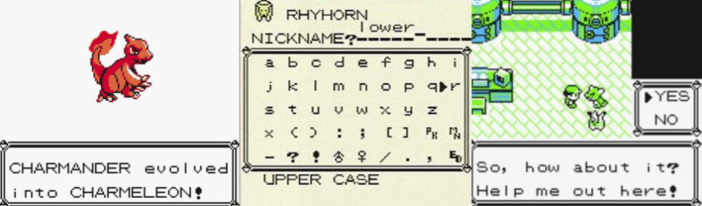 Winning Trainer battles also nets you PokéDollars, which you can spent in PokéMarts and at vending machines on healing items and other useful gear to help you out in battle or in raising your Pokémon. Items and Pokémon are stored in PCs when you run out of room (you can only have six Pokémon at a time, so any additional Pokémon are automatically transferred to your PC, though you’ll need to heal them if you choose to use them) and the game allows you to manually save your progress at any time (though you only get one save file to use). I recommend saving frequently, and especially before Gym Leader battles or encounters with Legendary Pokémon as this allows you to reset the game on the off-chance that you’re defeated, thus sparing you from losing money. You’re given two primary goals in the game: Battle the eight Gym Leaders to earn their badges and challenge the Pokémon League and complete Professor Oak’s PokéDex, which you do by capturing every Pokémon in the game. When you encounter a Pokémon, its basic data is stored in this encyclopaedia so you can see where it appears on the overworld; you can then hunt it down and catch it and either try to capture its next form or “evolve” it by levelling-up, using special stones, or trading it. The majority of Pokémon will evolve into at least one extra form through levelling-up, which will add their new form’s data to the PokéDex and make them stronger; you can cancel evolution at any time by pressing B and this is sometimes recommended as Pokémon learn moves faster in their weaker forms and some moves can only be learned prior to evolution. Similarly, each Pokémon can only know four moves at a time; when it grows strong enough to learn a new move, you can choose to either replace an existing move or not learn the new one, but you’ll need to visit the Move Deleter to do this outside of levelling-up or to forget Hidden Machine (HM) moves. When you capture a Pokémon, you’re given the option of nicknaming it; again, this doesn’t really do anything beyond personalising them to your Trainer and your characters are limited, but it’s a nice touch for making your team unique.