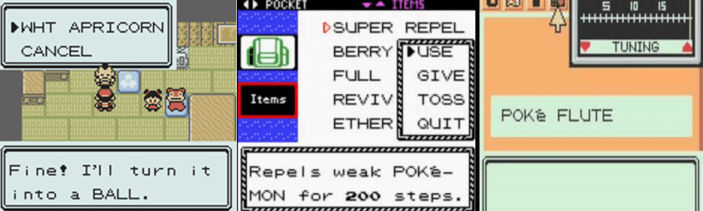Power-Ups and Bonuses: As you explore the wide land of Kanto, you’ll find plenty of pick-ups strewn around, be gifted them from NPCs, or will be able to buy a variety of items from PokéMarts. These include healing items like Potions, Super Potions, and Hyper Potions, restorative items like Revive and Max Revive, and status-healing items like Awakening and Antidote. These are relatively commonplace, though are not widely available across the region; the PokéMart in Pewter City will forever sell the basic PokéBalls and Potions, while only the more expensive items are available in Celadon City and at Victory Road. Other items can also be acquired that can aid you in battle; PokéDolls can help you flee from battle, the likes of X-Defend will boost your stats for that battle, and you can snag a PokéFlute that lets you wake up sleeping Pokémon without having to constantly buy Awakenings. Vitamins and evolutionary stones are far harder to find on the overworld, but can be bought from Celadon City’s Department Store and are great for raising individual stats and quickly evolving Pokémon to their more powerful forms, and you can also fend of random encounters with repels, find Nuggets to sell for cash (and sell most items you find), a Coin Case to play slot machines, and key items like the Itemfinder and EXP All if you capture enough Pokémon to appease Professor Oak’s aide.
